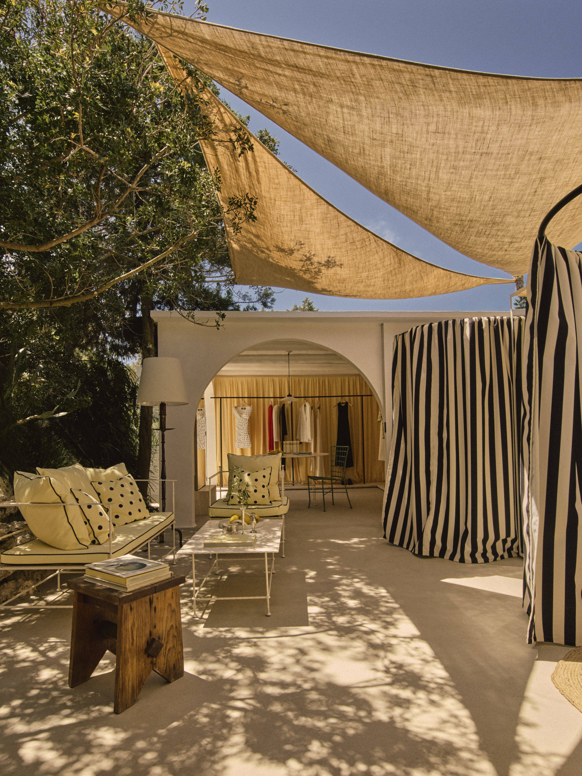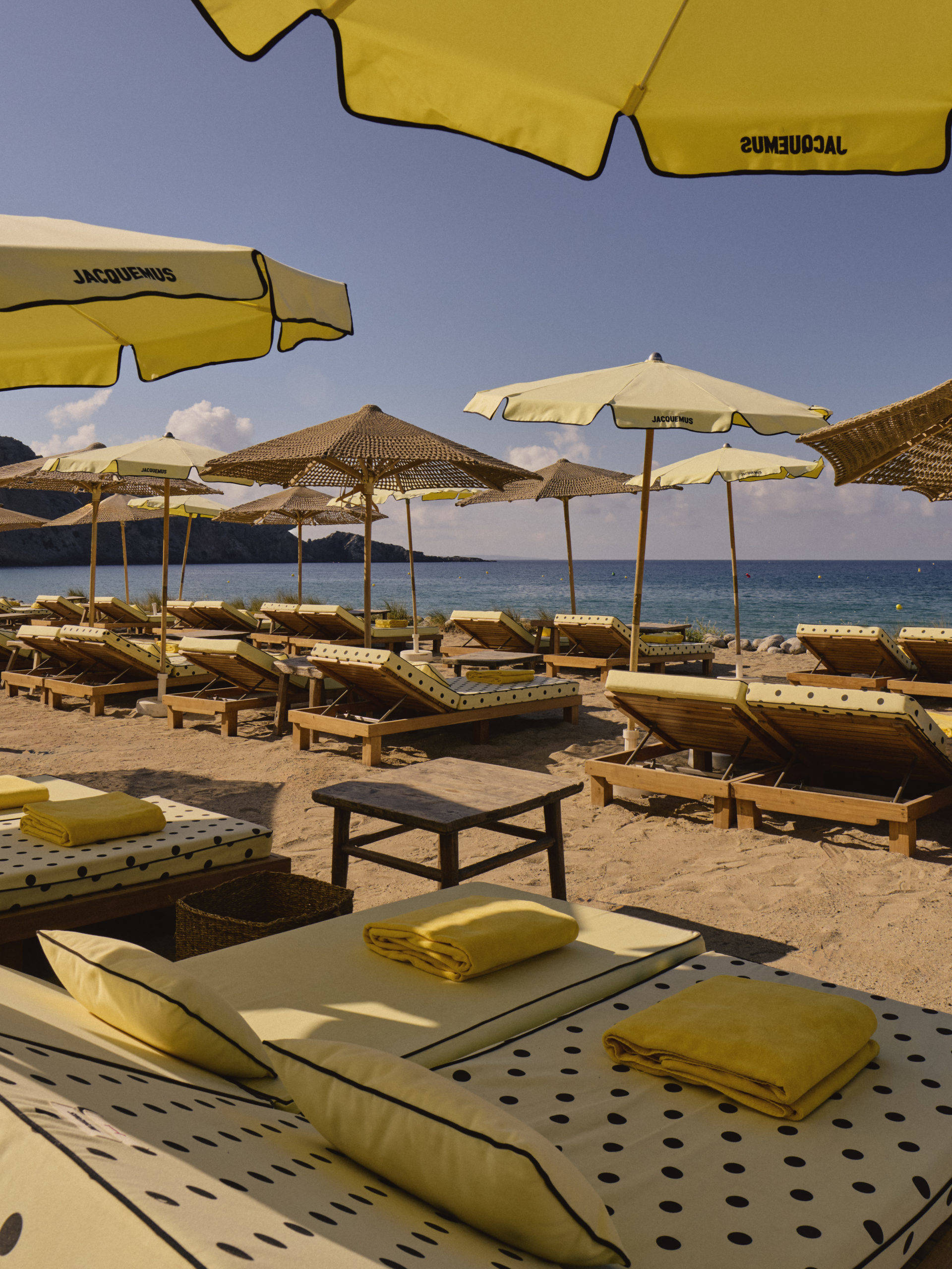 In Ibiza, Simon Porte Jacquemus brings his sunny world to the golden sands of Cala Jondal. Set against a beige-cream Provençal backdrop bathed in light, it blends the relaxed Balearic vibe with refined minimalism. Pristine sunbeds line the turquoise sea, the menu pays tribute to the Mediterranean, and music accompanies the sunset with perfectly tuned rhythms. Just steps away, the pop-up store showcases the season’s most coveted pieces—ready to slip into a tote bag before heading to the bar for one last golden-hued cocktail.