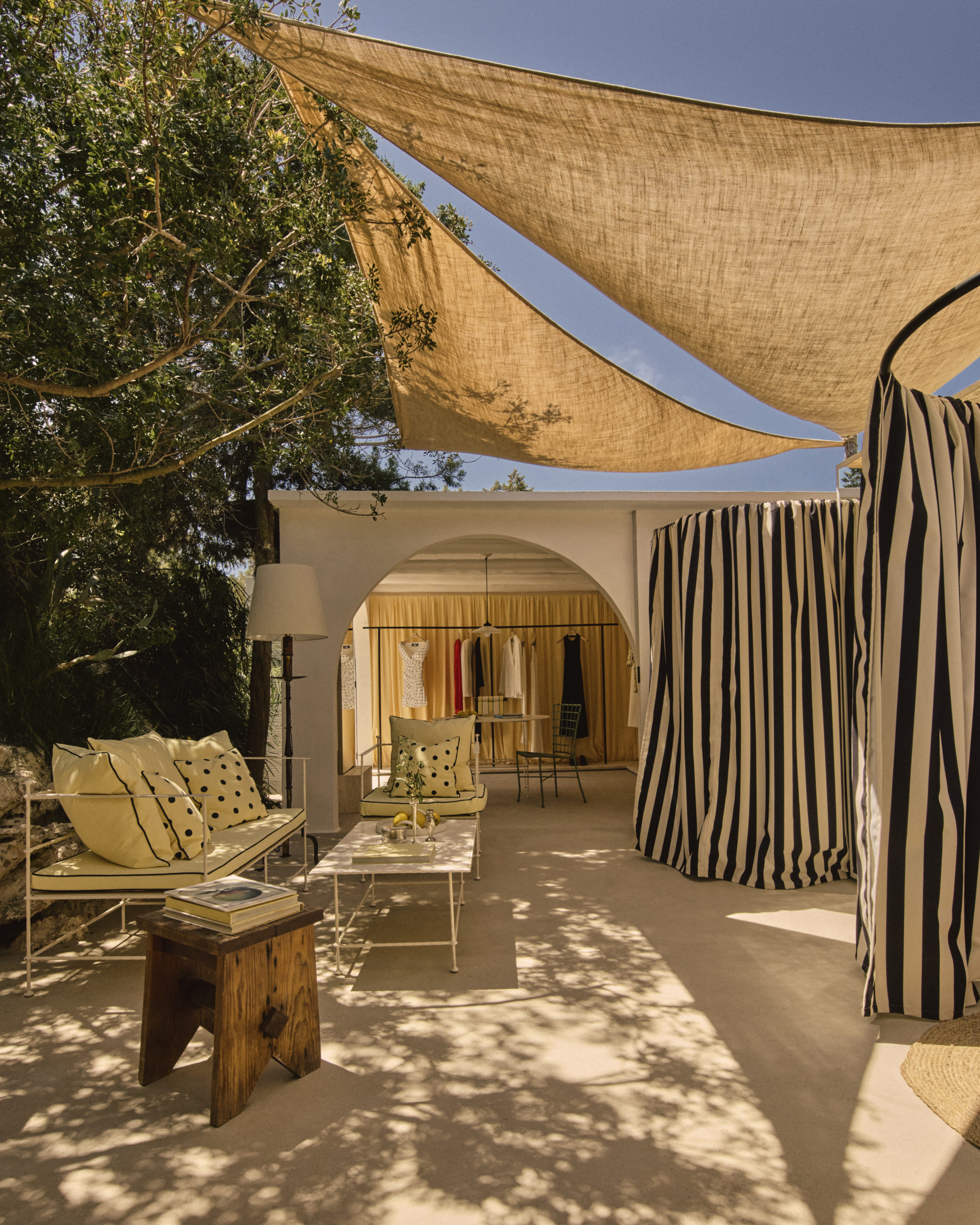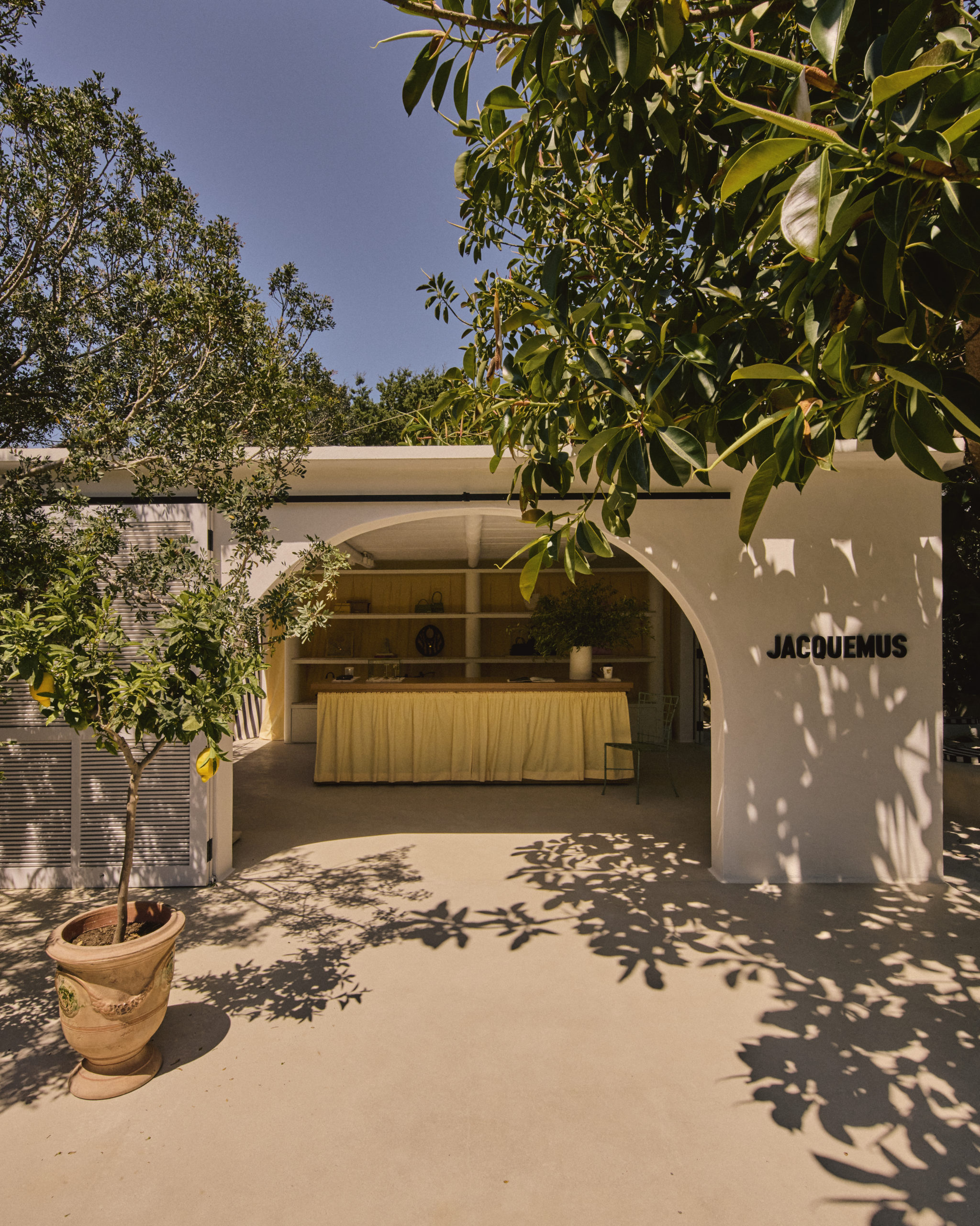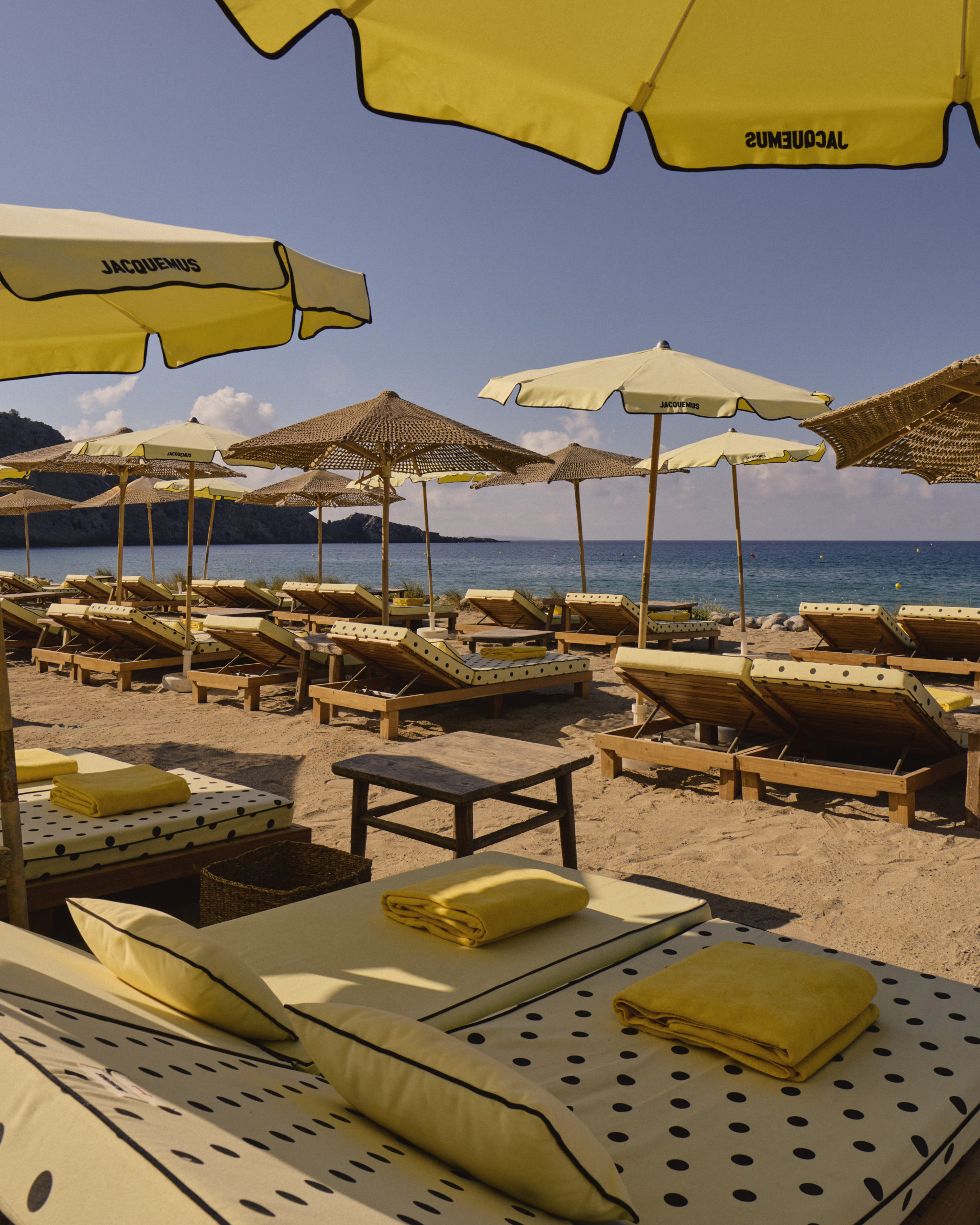 In Ibiza, Simon Porte Jacquemus brings his sunny world to the golden sands of Cala Jondal. Set against a beige-cream Provençal backdrop bathed in light, it blends the relaxed Balearic vibe with refined minimalism. Pristine sunbeds line the turquoise sea, the menu pays tribute to the Mediterranean, and music accompanies the sunset with perfectly tuned rhythms. Just steps away, the pop-up store showcases the season’s most coveted pieces—ready to slip into a tote bag before heading to the bar for one last golden-hued cocktail.