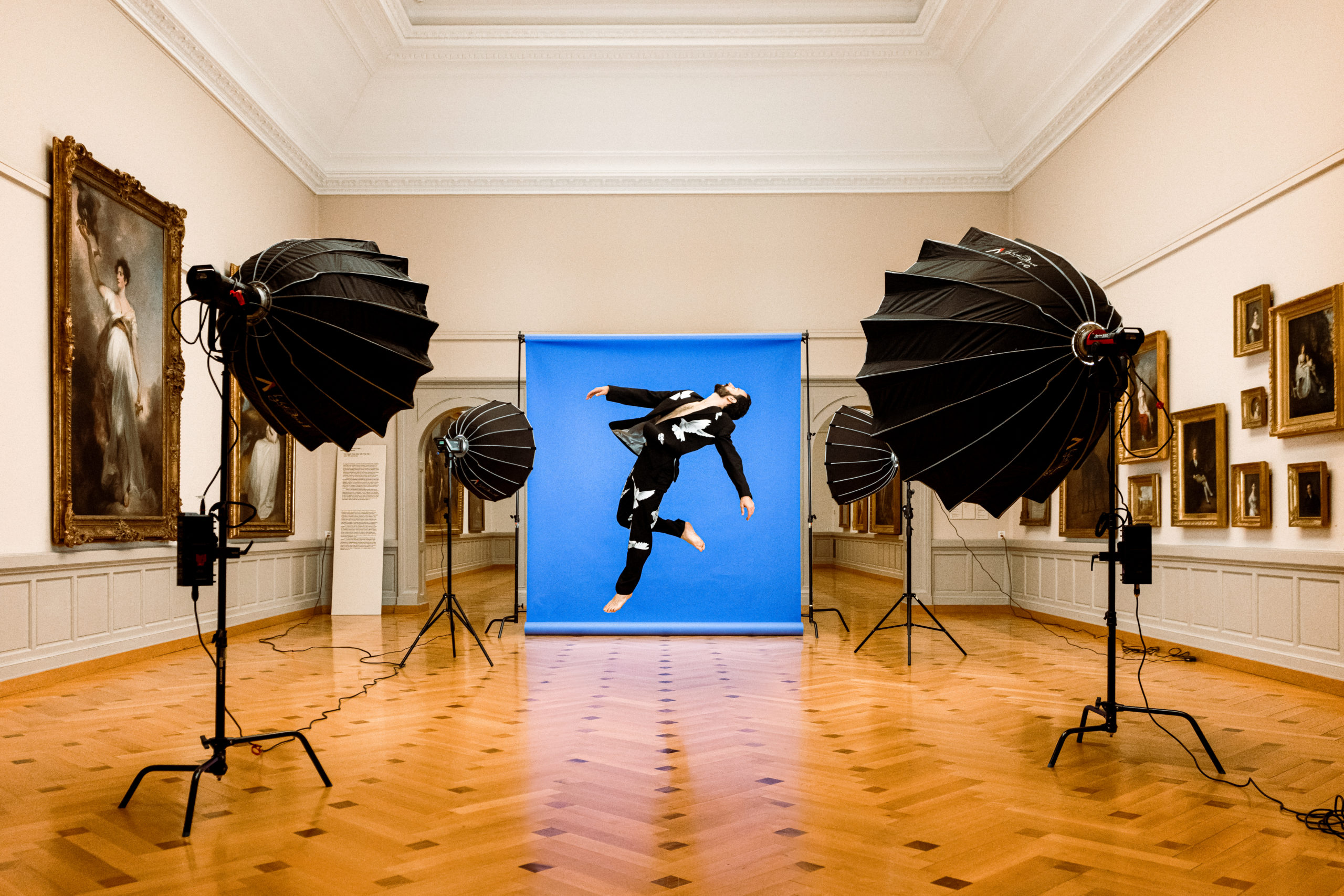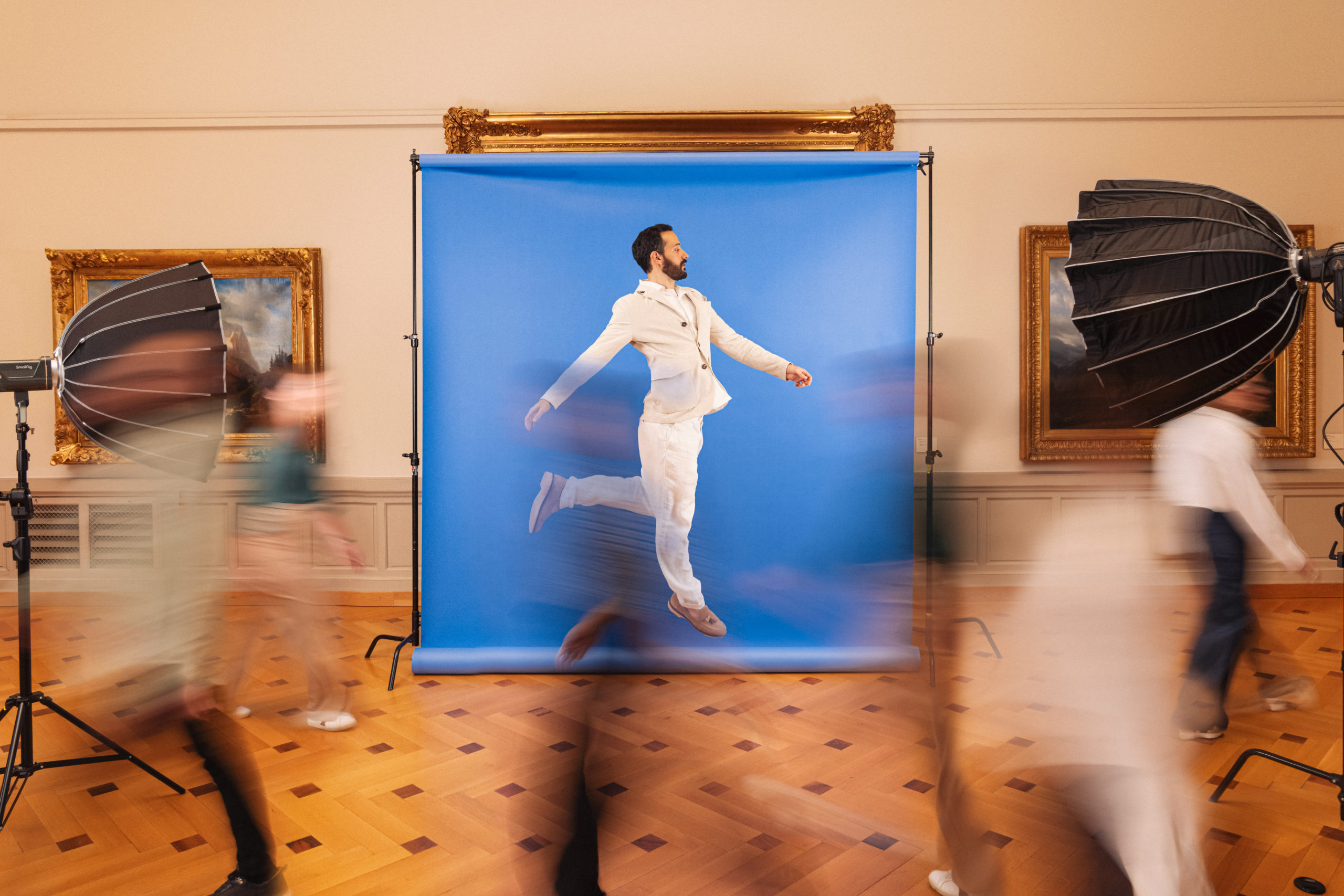 In this quiet space, surrounded by paintings and sculptures, he set up his photography studio. There he explored volume, light, and the weight of history, propelling his body into the air in a state of levitation. Some images show him suspended, almost unreal. Others reveal the behind-the-scenes process, where he appears focused and precise. He is simultaneously creator, performer, eye behind the lens, and subject of his own work. This fusion of roles gives rise to a hybrid series, somewhere between self-portrait and artistic manifesto. A reflection on the image itself and the intent behind it. The museum becomes a method. Emptiness becomes resource, substance. Open space turns into narrative. Through his ethereal presence, he evokes stories, surrounded by the ghosts of the place and the echoes of the past. In a world saturated with screens, alerts, and urgency, levitation becomes a counterweight. A quiet gesture in response to the heaviness of the ordinary. Every muscle contributes to creating that sense of suspension. Not to impress, but to remind. To remind us that a moment can still be held, that a breath can still exist amid the noise.