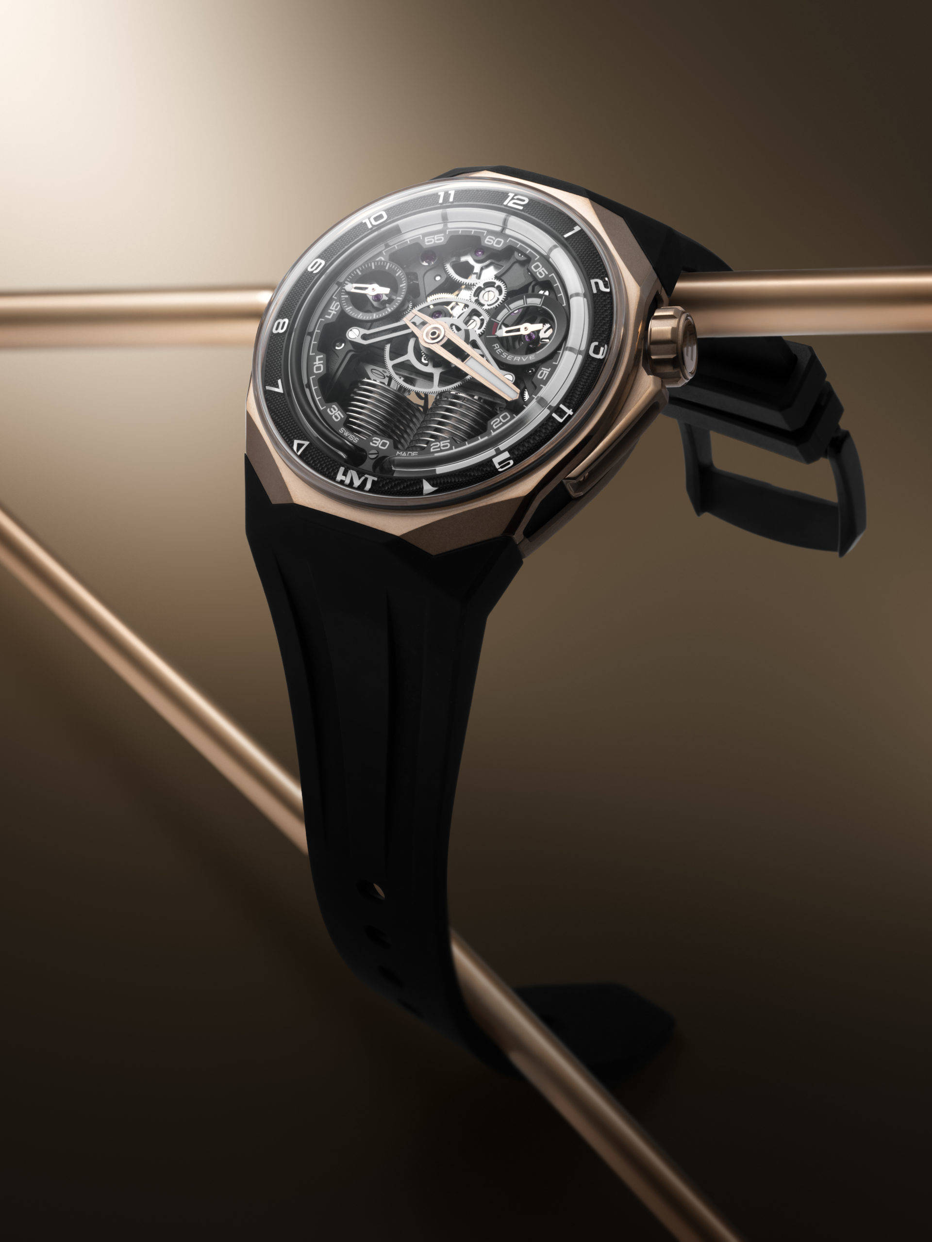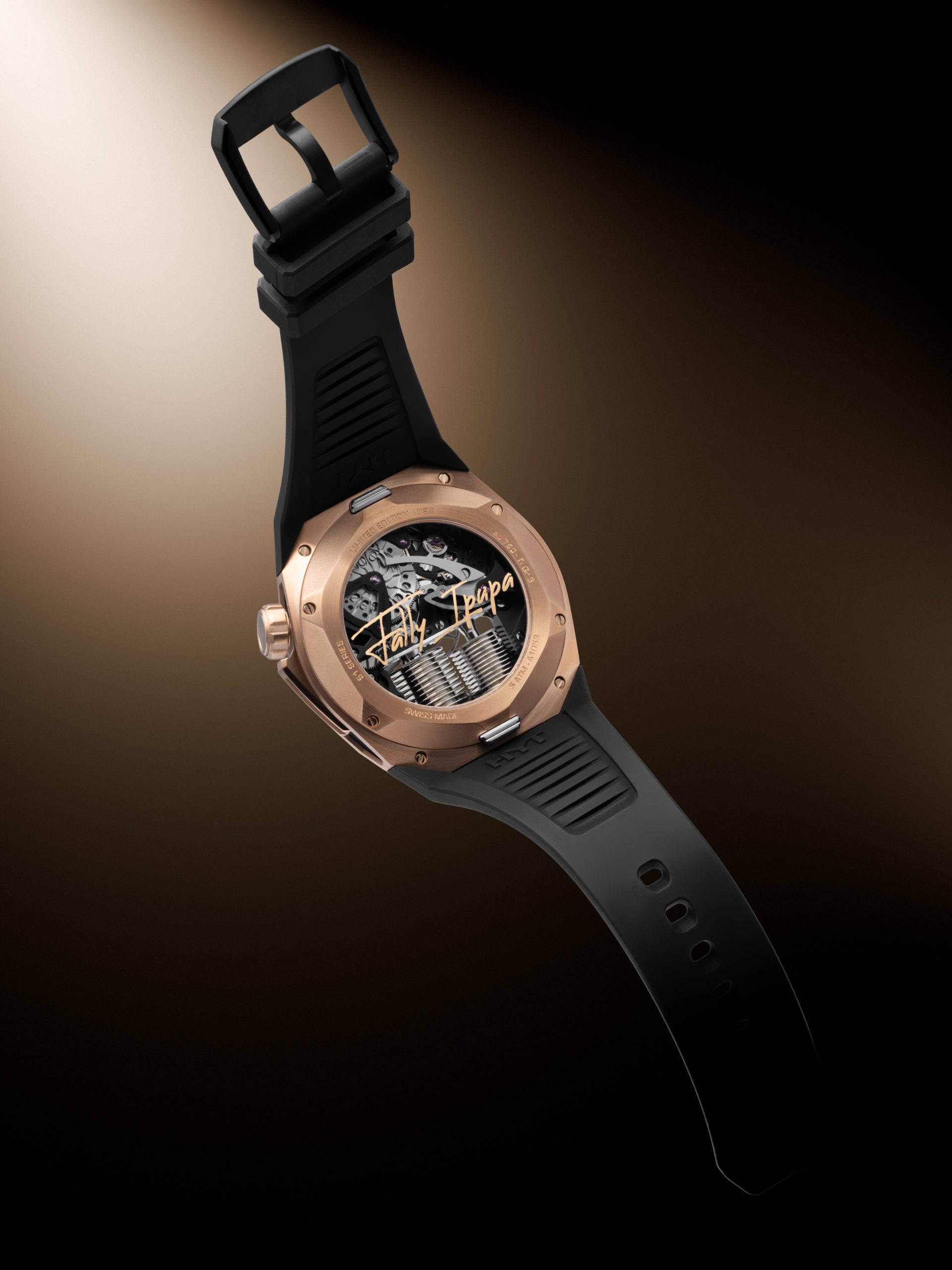 The ultimate expression of avant-garde craftsmanship and a strong artistic vision, this watch embodies the alchemy of precision technology and creative force. Inspired by the singer’s vibrant universe, it stands out with a bold case combining rose gold and black titanium, a refined setting for a revolutionary mechanism. Within an ultra-fine glass capillary, a black fluid traces the passage of time with fluidity, reinterpreting the spirit of ancient water clocks. Two ultra-thin alloy bellows orchestrate its movement with rare reliability. What one observes is not merely a technical feat—it is a new vision of time.