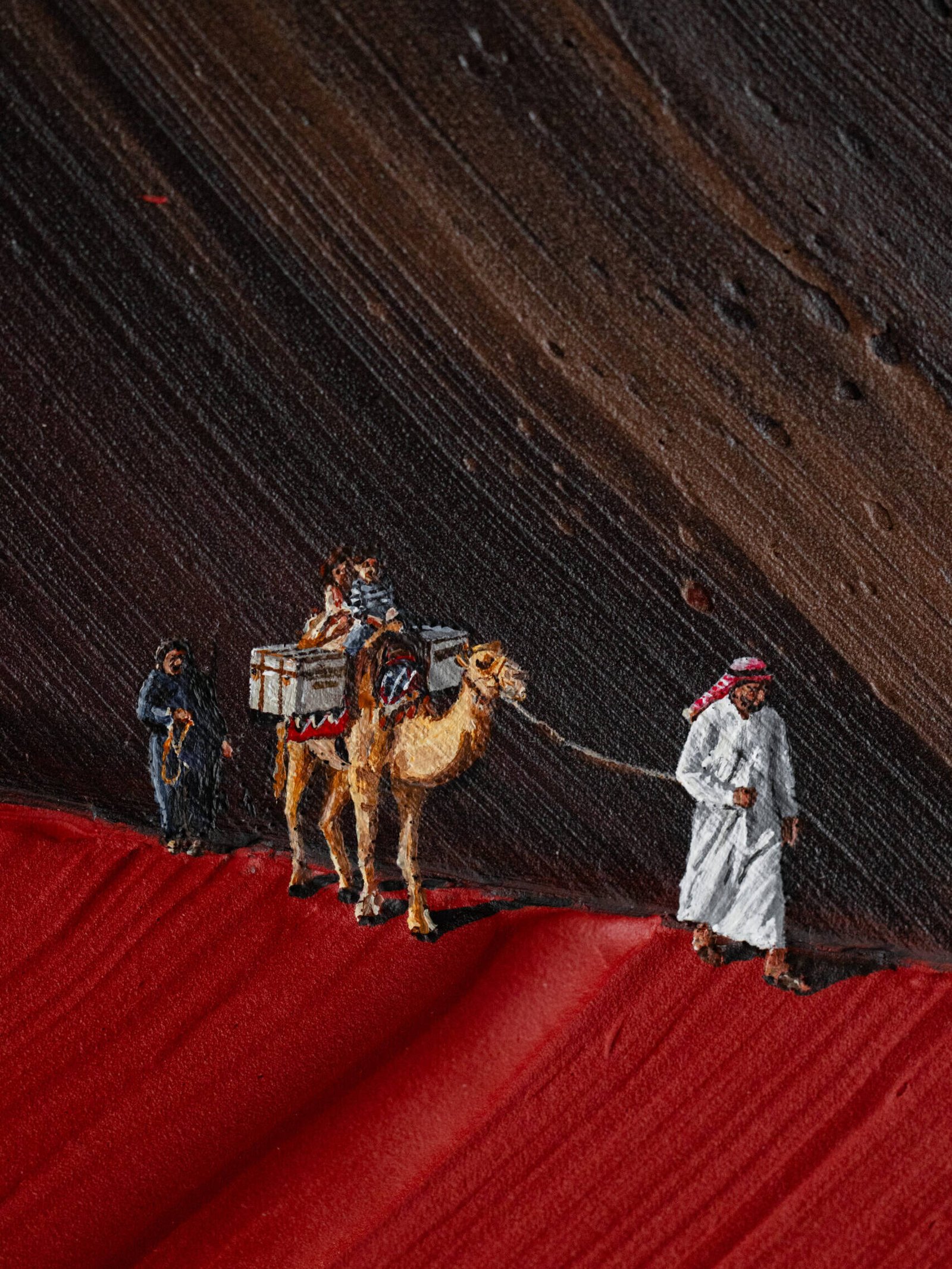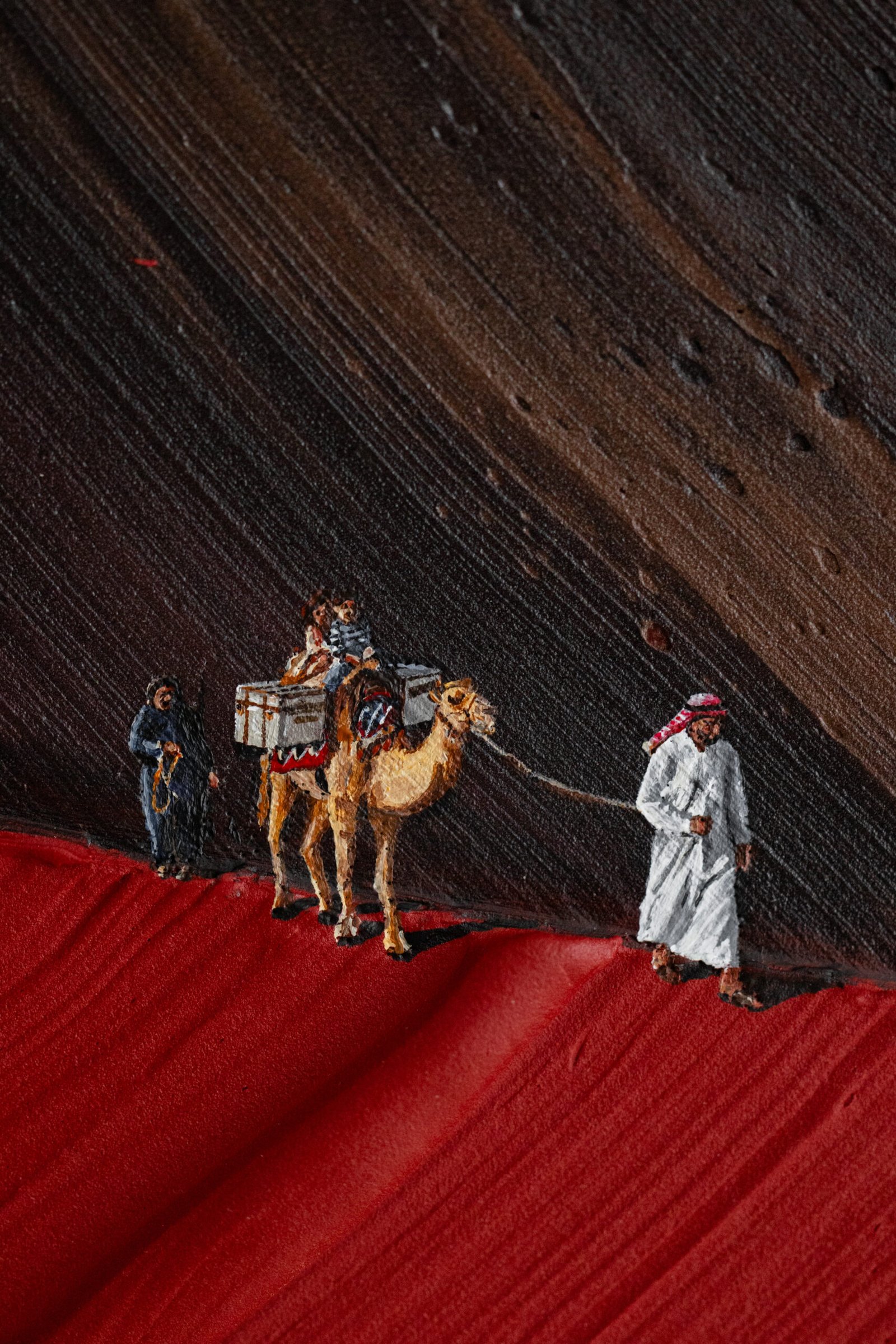 It’s this sensitivity to scale that makes Dubai a natural setting for CRACK. The collection is deeply rooted in desert landscapes: camels crossing open terrain, cracked clay tennis courts, rock climbers suspended against heat-scorched surfaces. “This crack collection is fully immersed in desert landscapes and other hot terrains,” he explains. “So for me to be exhibiting in a place that is forward-thinking and loves art and culture, this is the perfect place.”