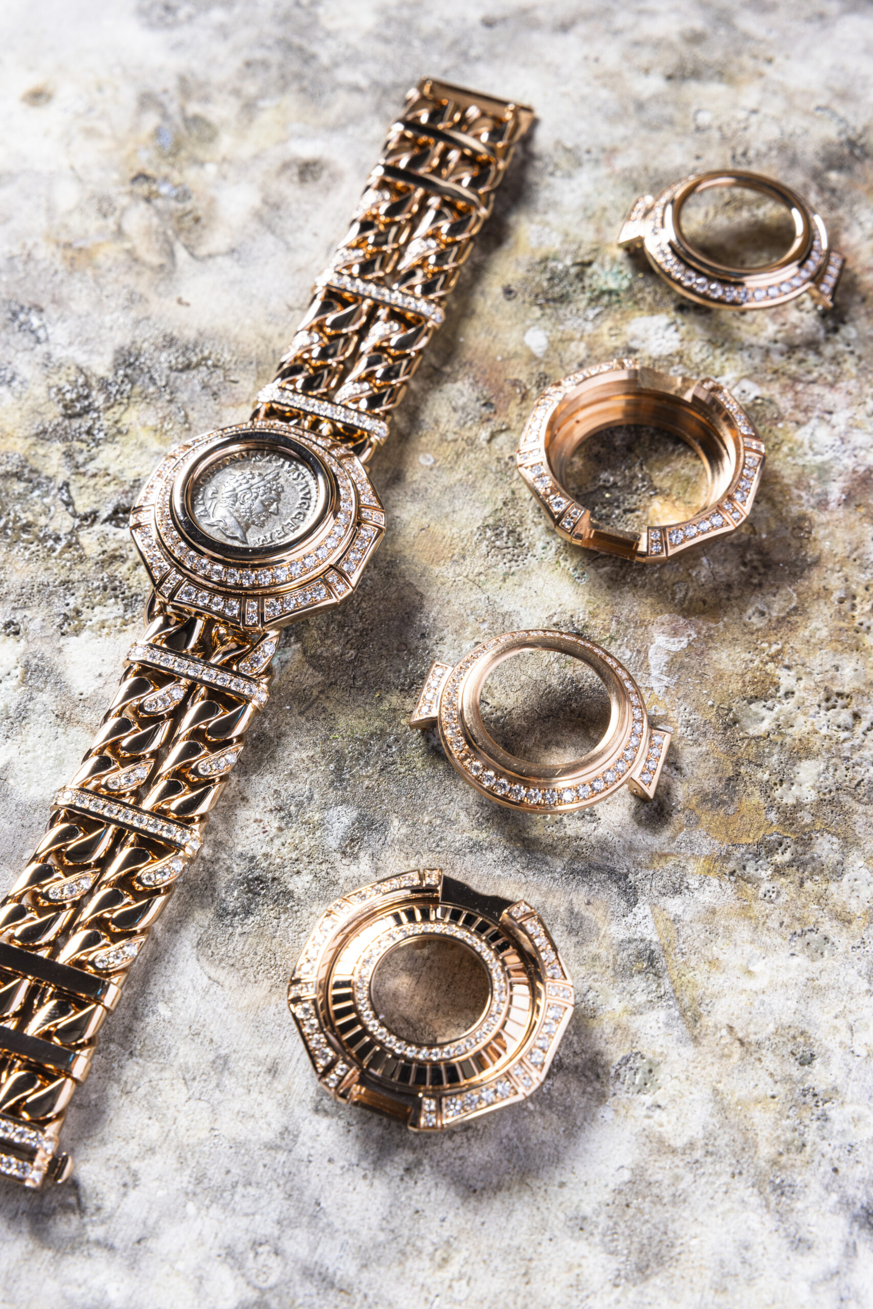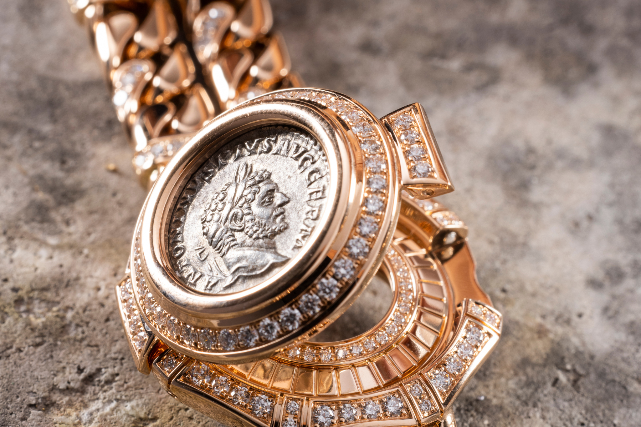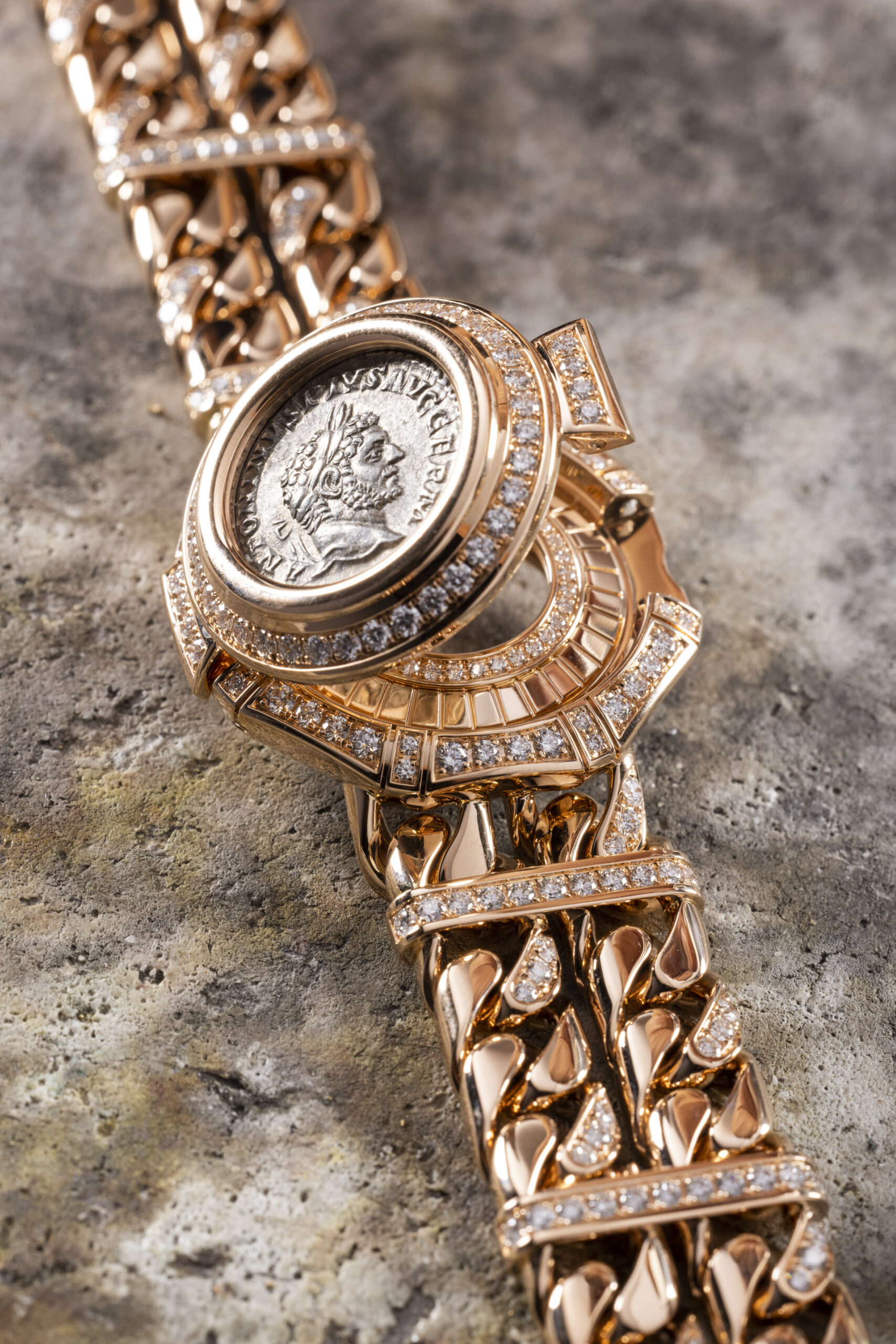 A successful combination of Bulgari’s jewelry craftsmanship and horological expertise, the Monete Catene watch bears the unmistakable signature of the Roman house founded in 1884. It exalts a treasure over 2000 years old, granting those who wear it on their wrist the ultimate privilege – to carry with them a fragment of history.