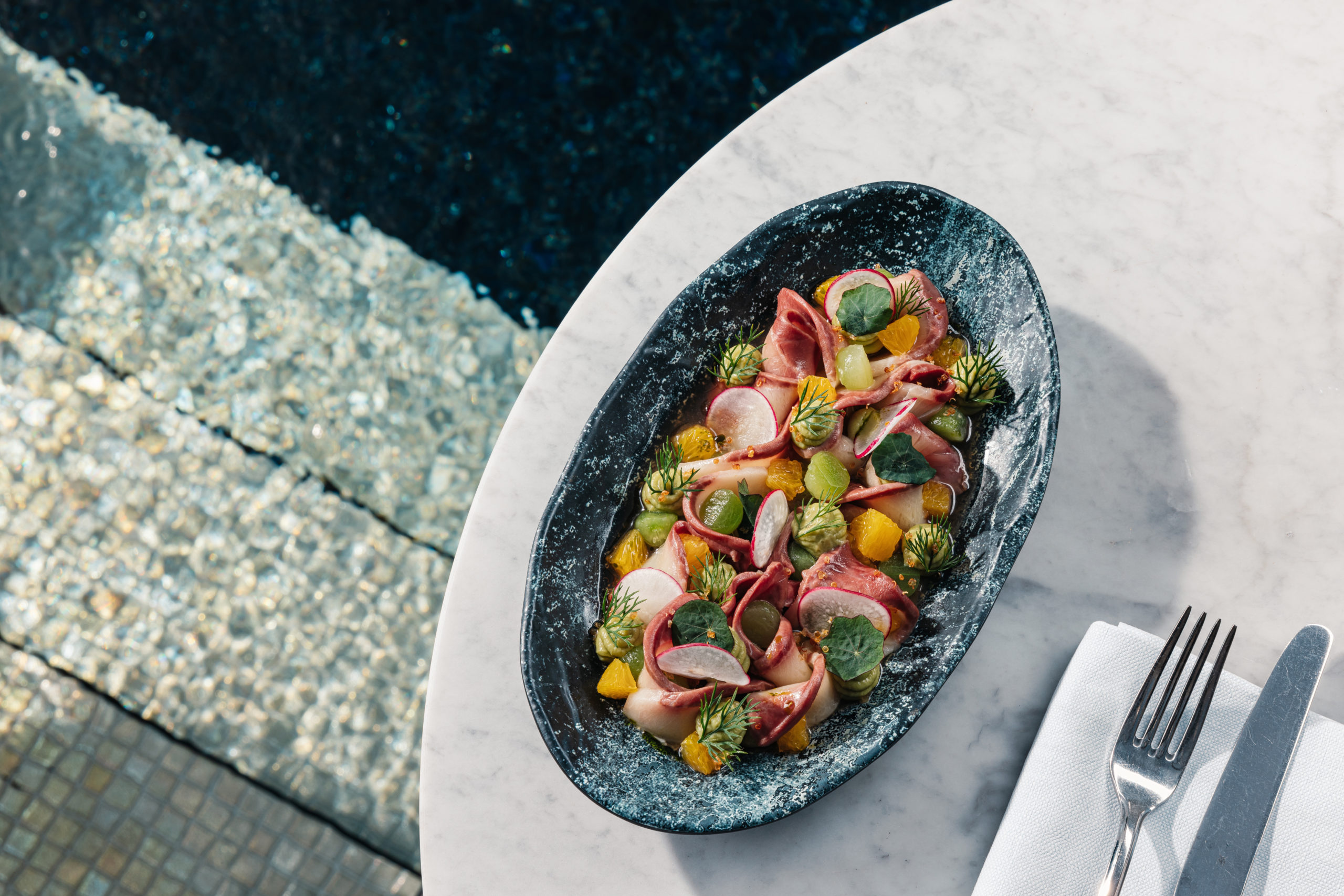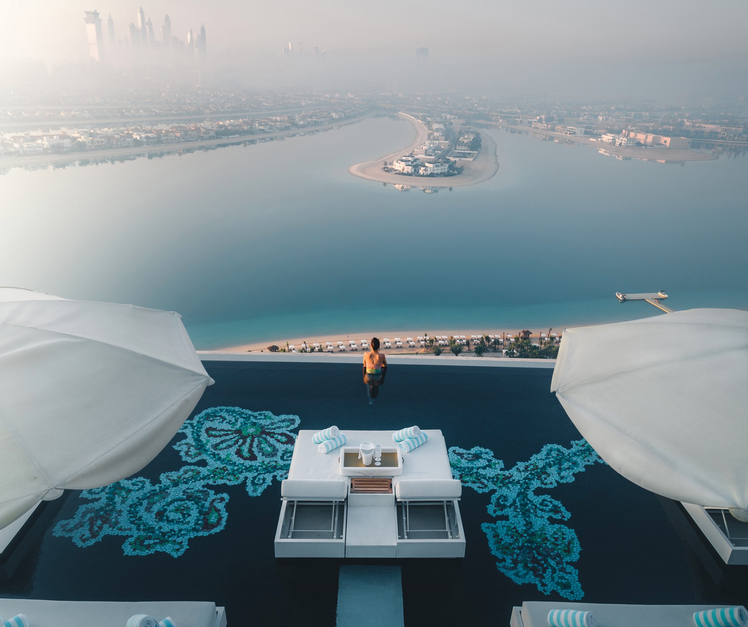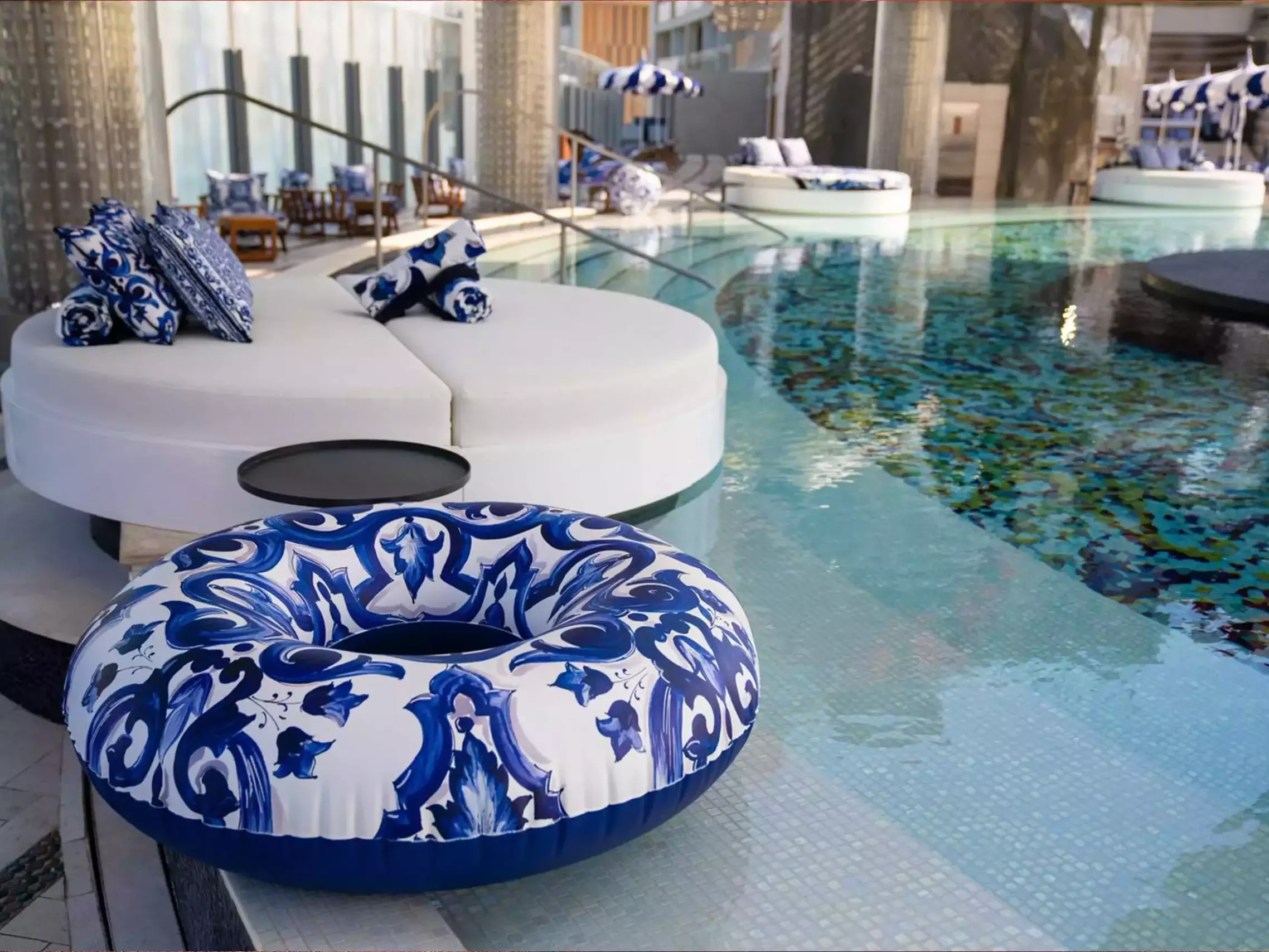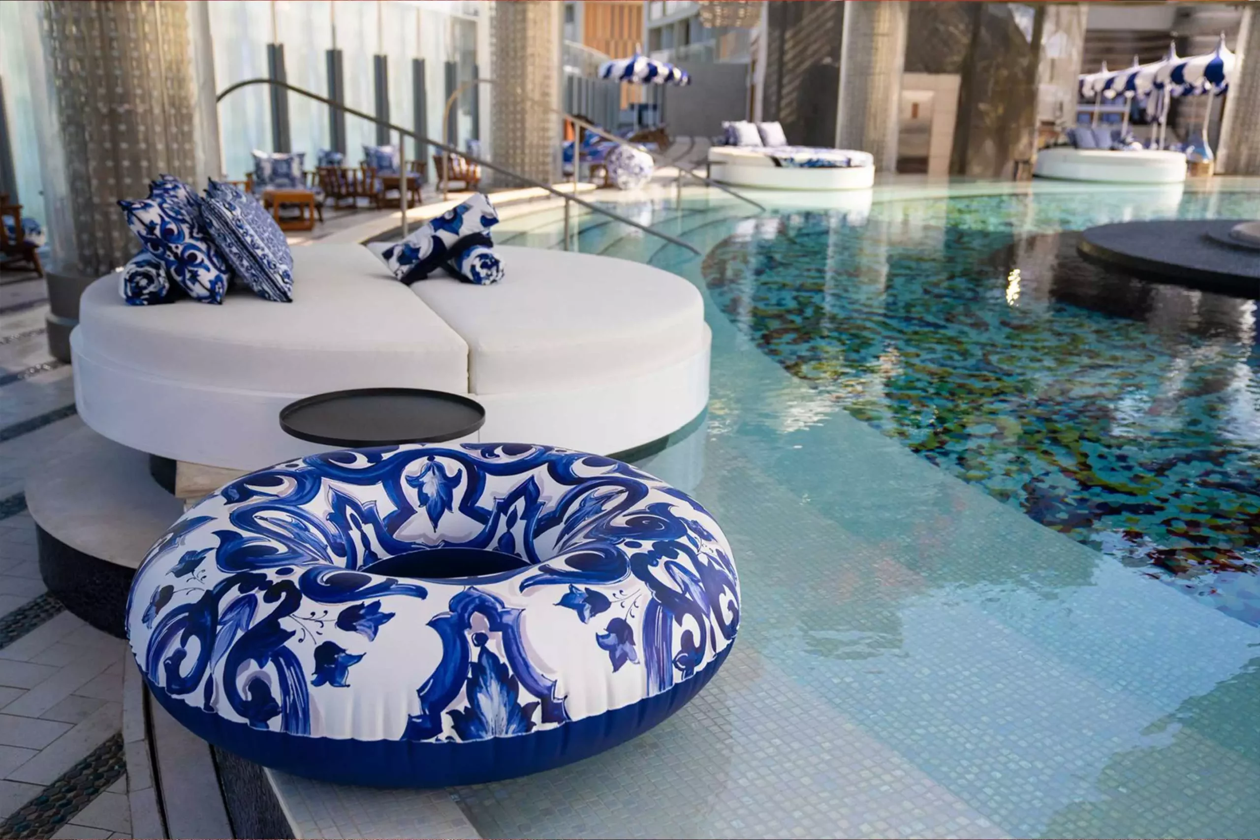 In February 2024, Cloud 22 underwent a stunning transformation with an unprecedented collaboration between Dolce&Gabbana and Ounass, Dubai’s renowned online luxury platform. We were captivated by Dolce&Gabbana’s Blue Majolica print, which dominates the setting. From parasols to pool floats, every decorative element evokes the vivid colors of the Mediterranean, infusing the space with freshness and elegance. It felt like a tribute to the beauty of the Italian coastline—both striking and soothing at once.
