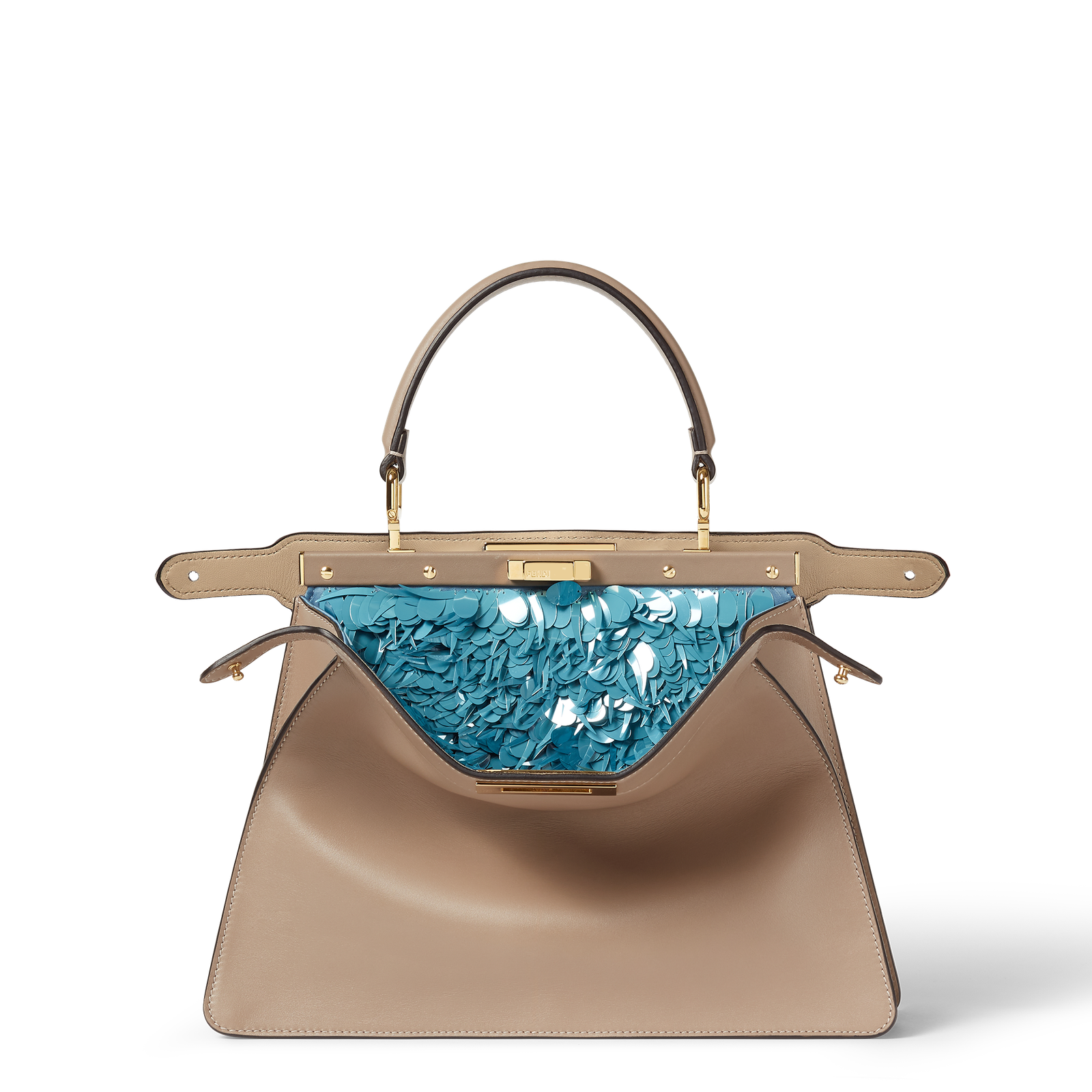 Inside, Fendi orchestrates an explosion of craftsmanship. Sequins, pearls, crystals, and studs compose precious landscapes, each entirely handcrafted. Some pieces require more than forty hours of work, where violet sequins illuminate mahogany-brown leather, while shades of turquoise and emerald green unfold in asymmetrical compositions. The pinnacle of this artisanal celebration is a high-jewellery version in pink mink, adorned with an abstract floral embroidery fully executed in pearls, demanding over two hundred hours of craftsmanship. Through this new interpretation, the Peekaboo asserts more than ever a vision of femininity, bold without ever being imposing, sophisticated, instinctive, and free.