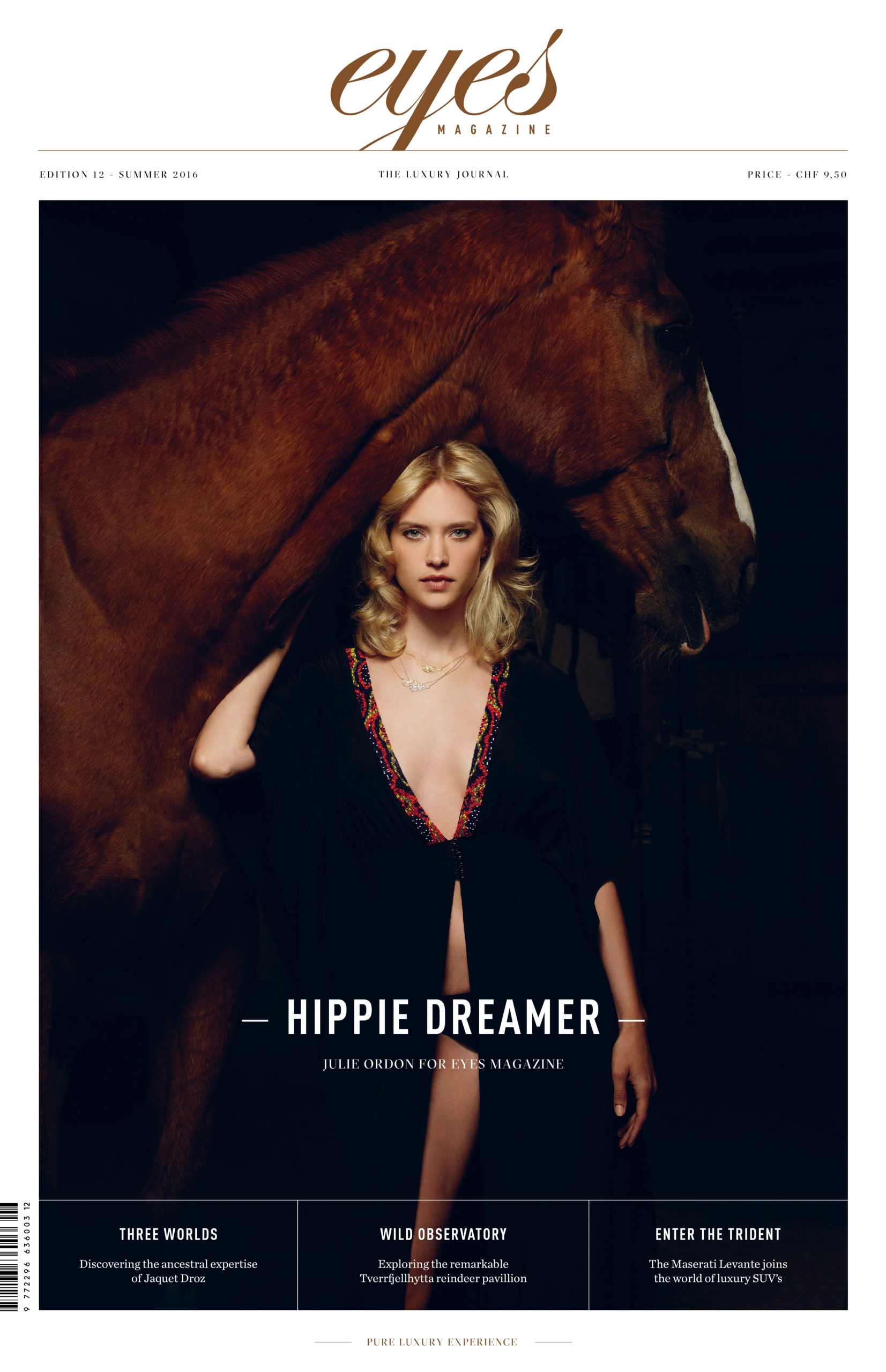 This is the story of a big bad wolf, representing haute couture, and a little red riding hood, symbolizing Julie Ordon, who was filmed by Bettina Rheims. This advertisement featuring the Swiss model, who became a star on the small screen for a Chanel lipstick, has traveled around the world. Taking the reins of her notoriety, Julie revealed herself on the cover of Eyes Magazine with a new look, more bohemian and chicly soft. Without artifice, with understated tones and an emotional presence, the shooting’s scenography became as natural as it was authentic. Luxury was her, her sensations, her green eyes lost in dreams, the innocence of her perfectly featured face, and nothing else was needed but that great horse in the shadows, tamed, protective, and wise.