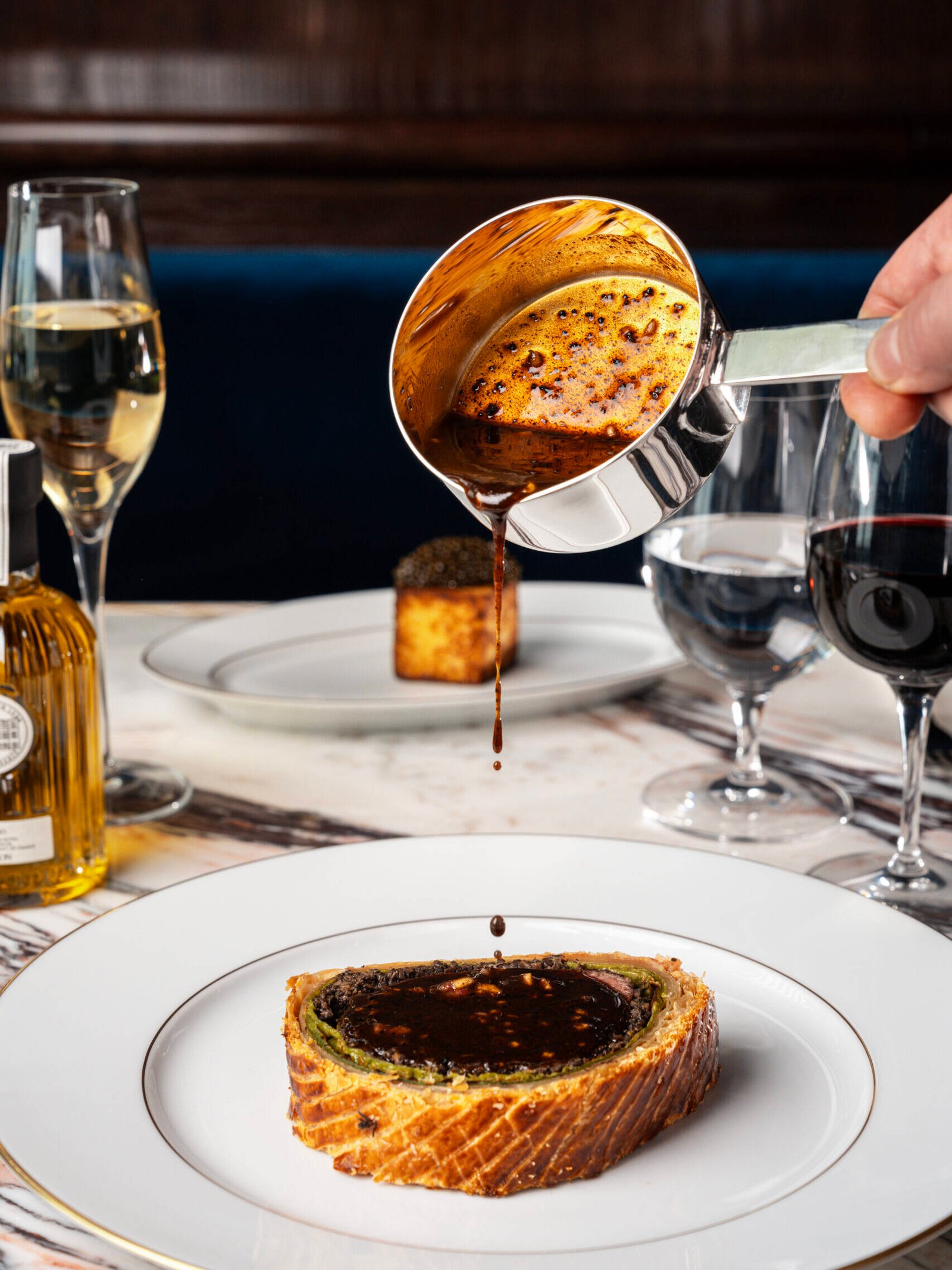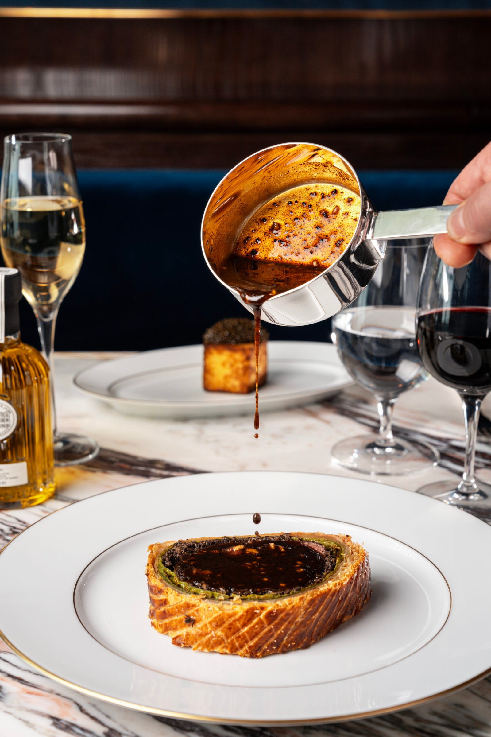 Further along, the menu deepens in tone. Carabineros are paired with a concentrated head jus and bright kaffir lime, offset by a nori-laced potato roll, an interplay of land and sea that feels both intuitive and daring. The famed Beef Wellington, encased in immaculate pastry with mushroom duxelles and veal jus, anchors the experience with a classical permanence. Desserts, meanwhile, tread the line between nostalgia and refinement via a red berry pavlova with confit and sorbet, and a generously scaled pistachio madeleine.