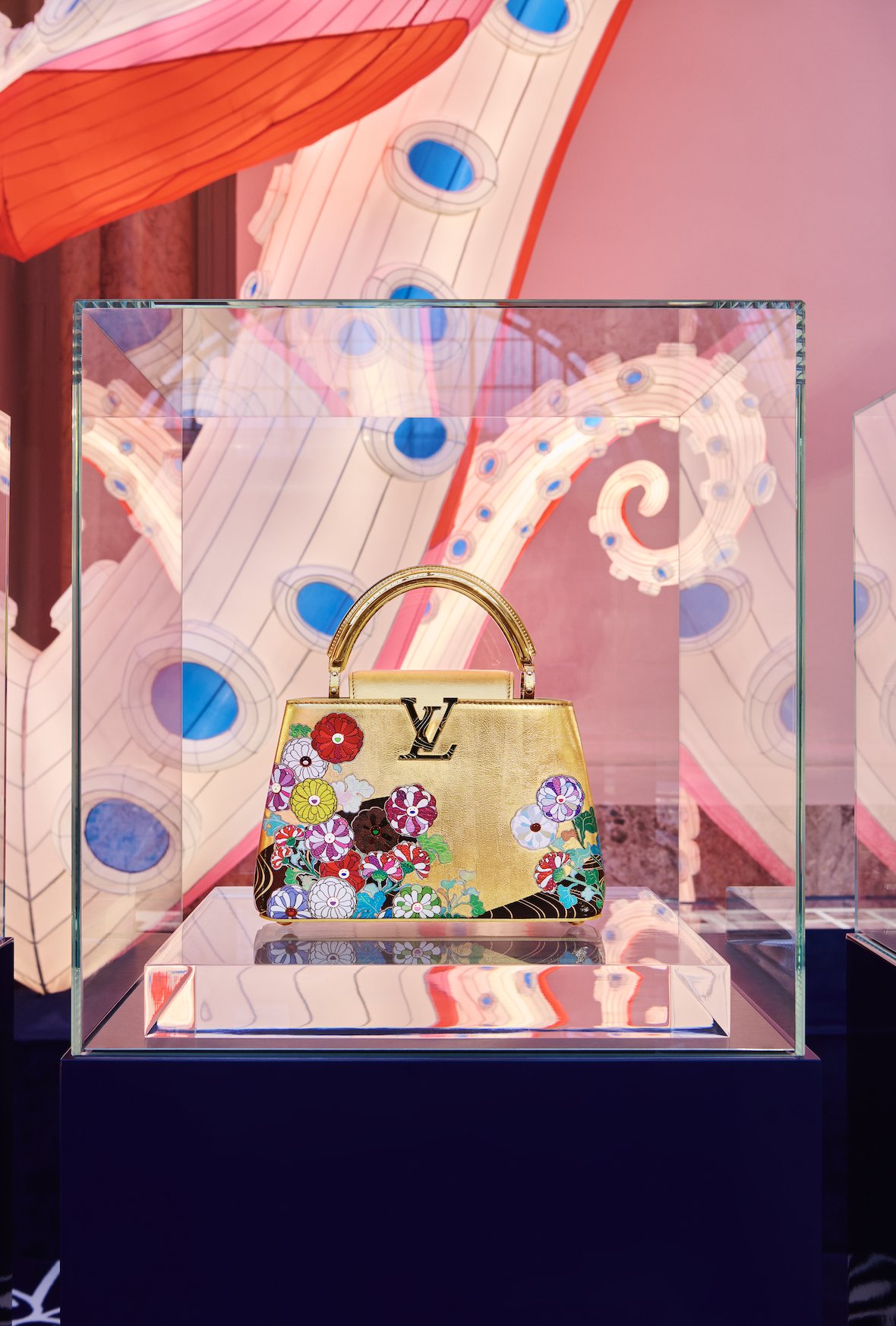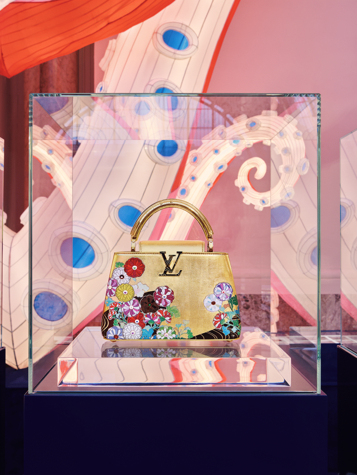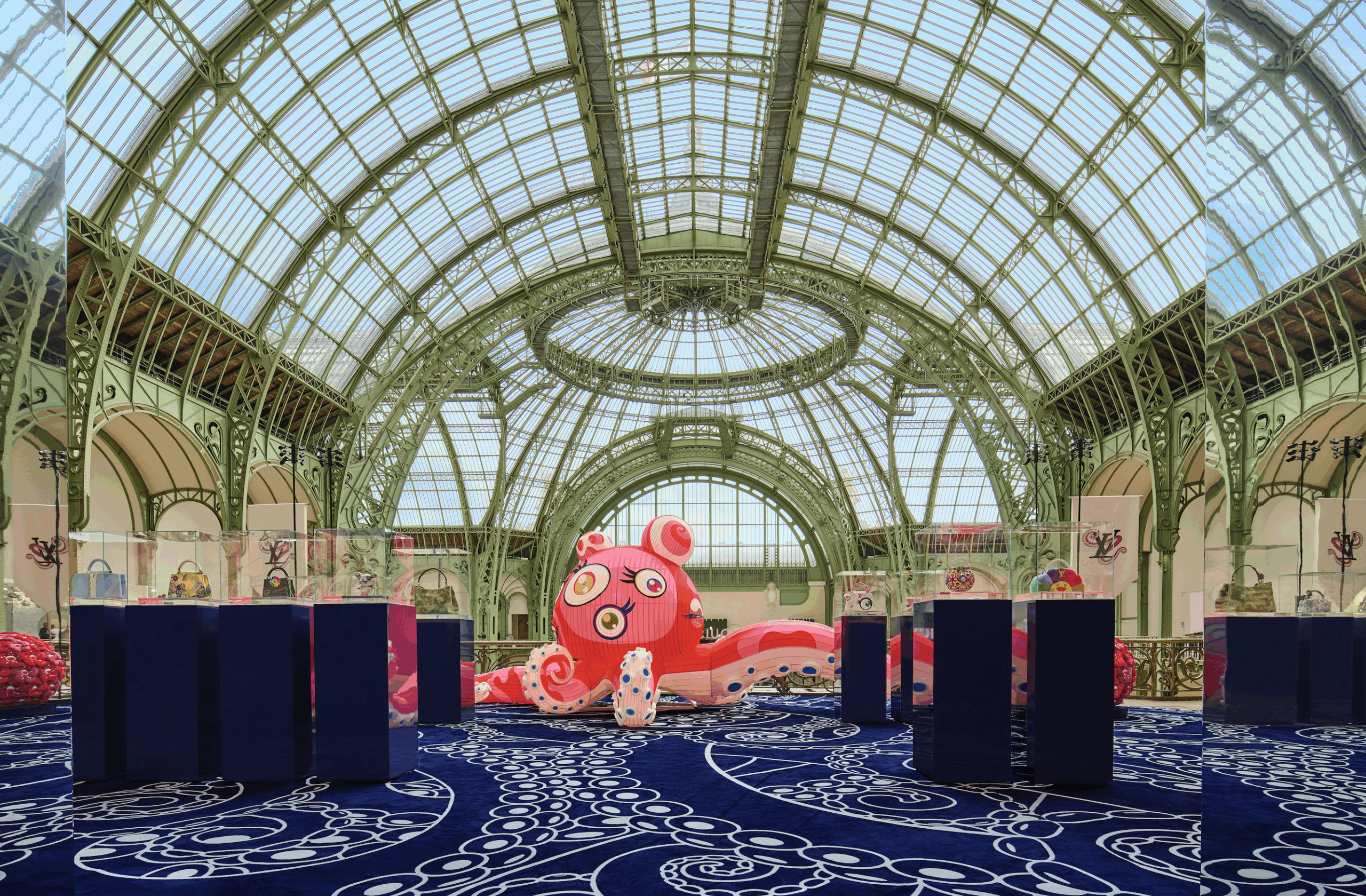 At the heart of the Balcon d’Honneur, visitors encounter a spectacular installation imagined by Murakami: an eight-metre-tall monumental sculpture of an octopus inspired by Chinese lanterns. Its colourful tentacles spill into the space, guiding the public into a vibrant artistic universe infused with humour, exuberance, and poetry. Atop its glowing head, the artist’s recurring Jellyfish Eyes motif evokes the fear of being watched while transforming that anxiety into wonder. Surrounding this central piece, eleven creations from the Artycapucines VII collection showcase the seamless fusion of Murakami’s imagination with the Maison’s savoir-faire. Each bag, from the Capucines BB Golden Garden to the Capucines Mini Mushroom, features the Japanese artist’s signature motifs.