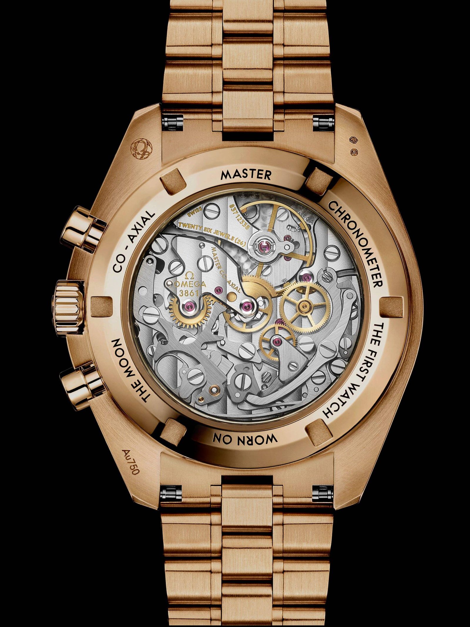 The collection arrives in two 42mm executions. In stainless steel, the Moonwatch leans into functional elegance, with rhodium-plated hands and indexes coated in white Super-LumiNova for uncompromising clarity, day or night. For a more precious take, OMEGA introduces an 18K Moonshine™ gold version. Developed in-house, the alloy’s softly luminous hue lends the watch a warmer presence. Moonshine™ gold hands and markers, also filled with white Super-LumiNova, are paired with a gold-toned PVD chronograph seconds hand, adding a subtle, sunlit glow.