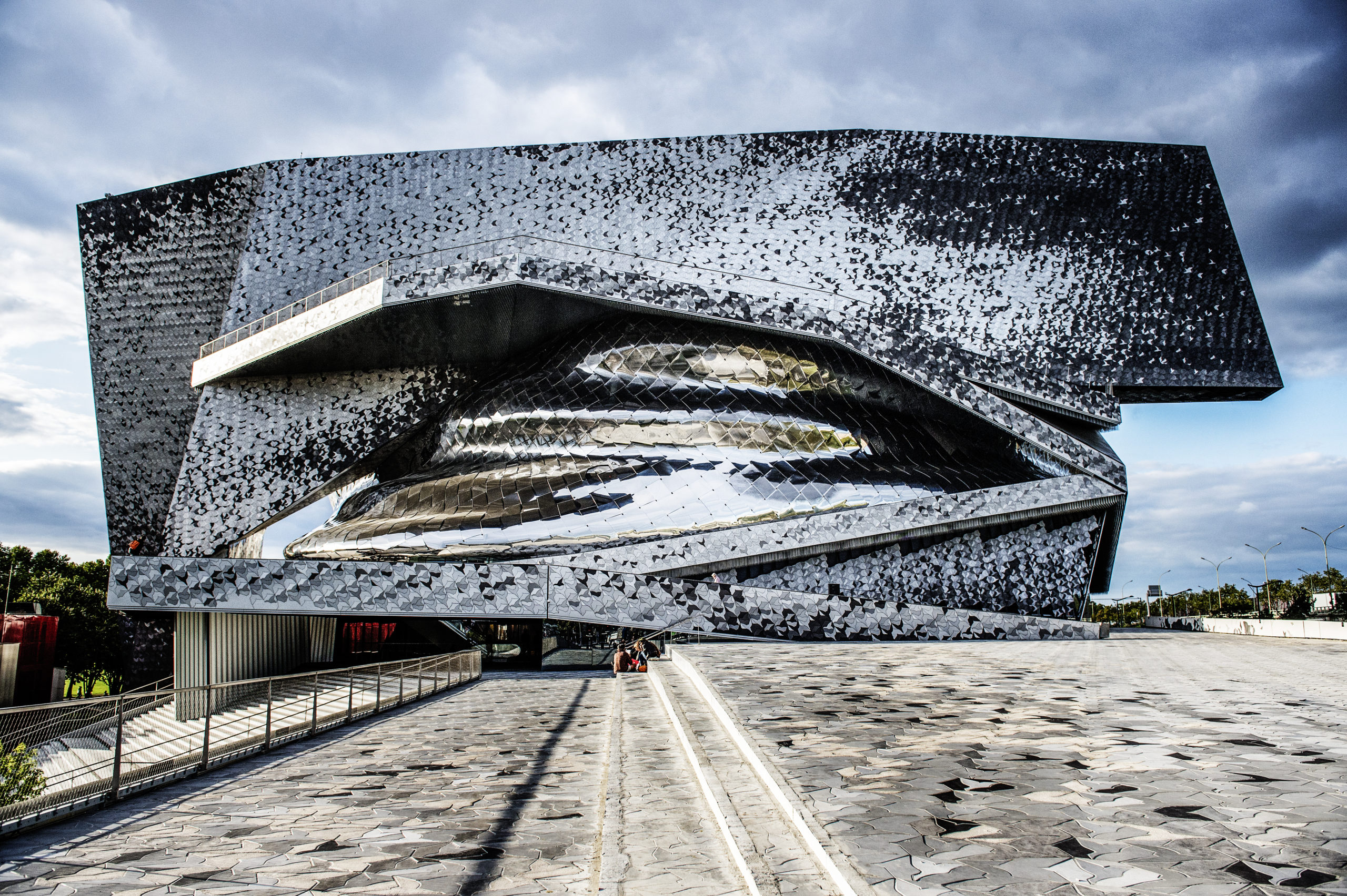 With its innovative architecture, its sculpted surfaces, and its gray hull covered with 265,000 aluminum sheet “birds,” the building takes on the look of a futuristic spaceship. Its swirling elements in shiny stainless steel, which enclose the concert hall, contrast sharply with its angular, matte aluminum outer shell.