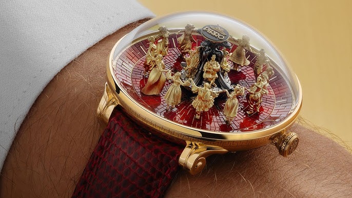 The dial of “Primordial Passion” is another tour de force. Crafted from Murano glass micro-mosaic, it features a striking red-to-black gradient composed of 1,500 stones in eight different colors. The eagle-claw-shaped hands, emblematic of the brand, add a powerful symbolic dimension. Through a collaboration with Agenhor, the central movement—a true engineering marvel—incorporates the dancers and brand symbols, merging mechanical innovation with watchmaking artistry.