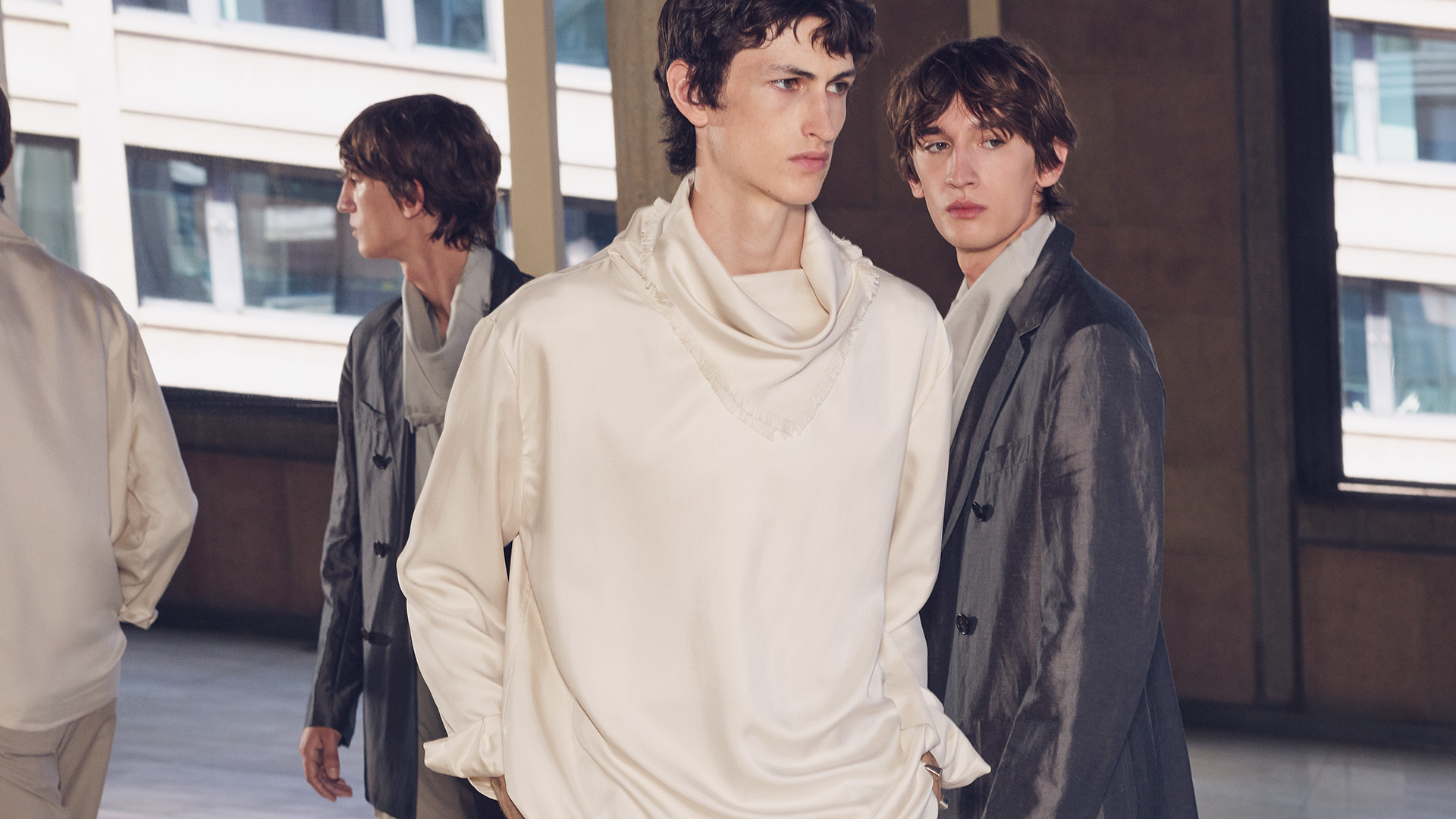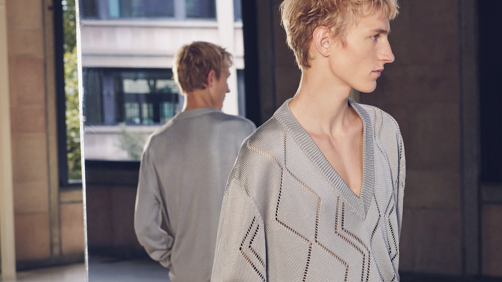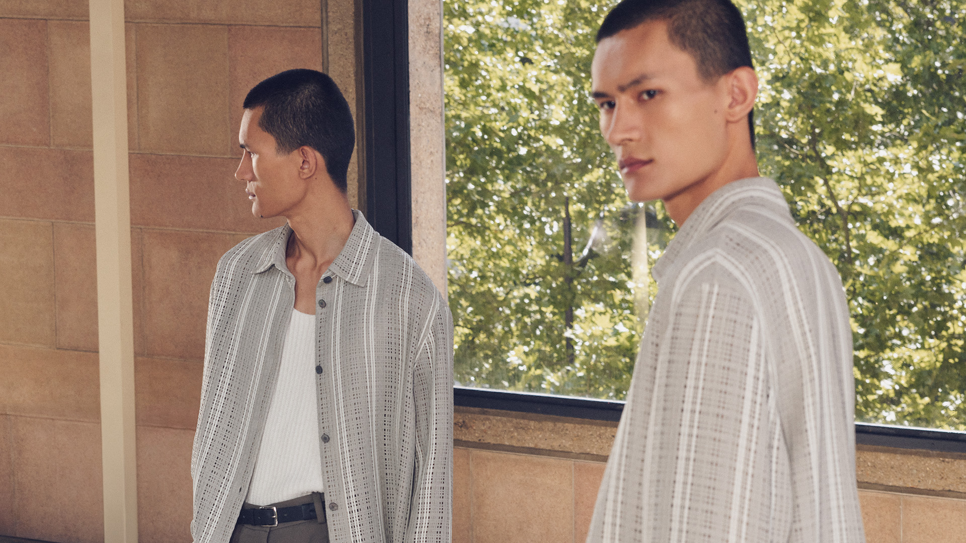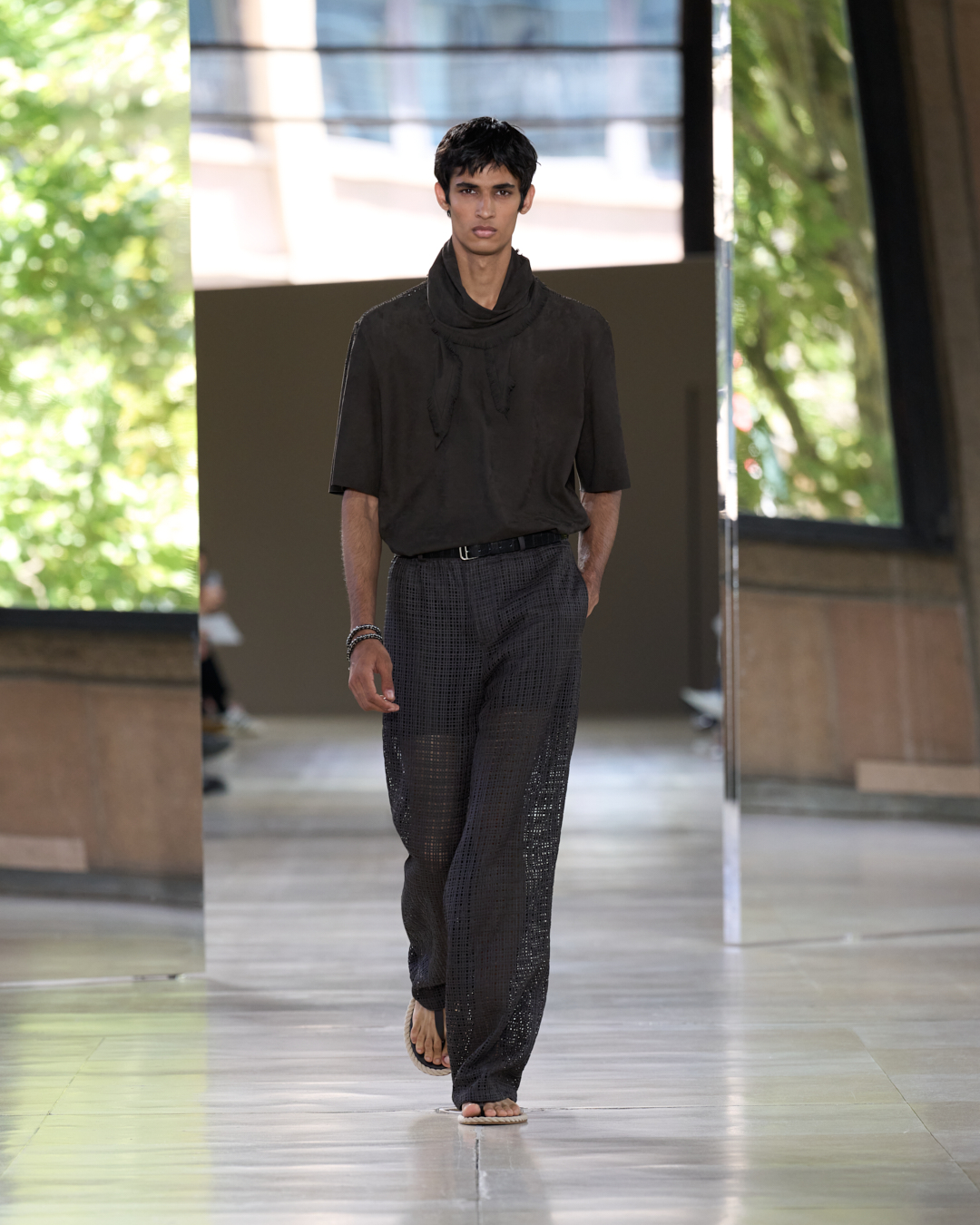 This new menswear wardrobe reveals itself through a harmonious duality of functionality and elegance. Shirt-jackets and blousons, positioned between windbreaker and blazer, blur the lines to create a subtle balance between structure and fluidity. Wide, intentionally cropped trousers are paired with rope sandals, elongating the silhouette while offering sophisticated ease perfectly suited to city life.
