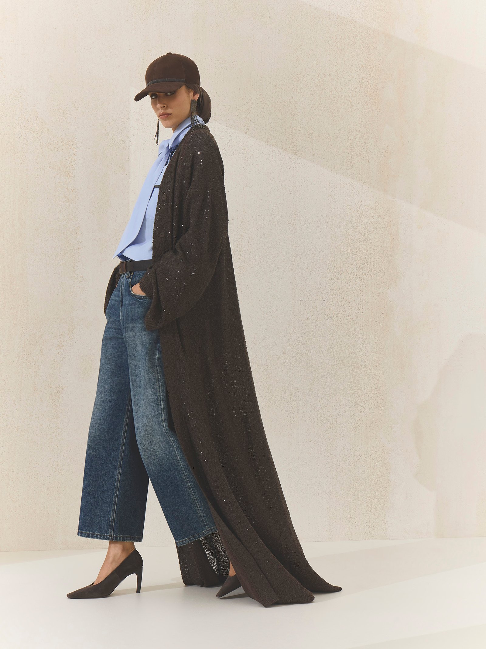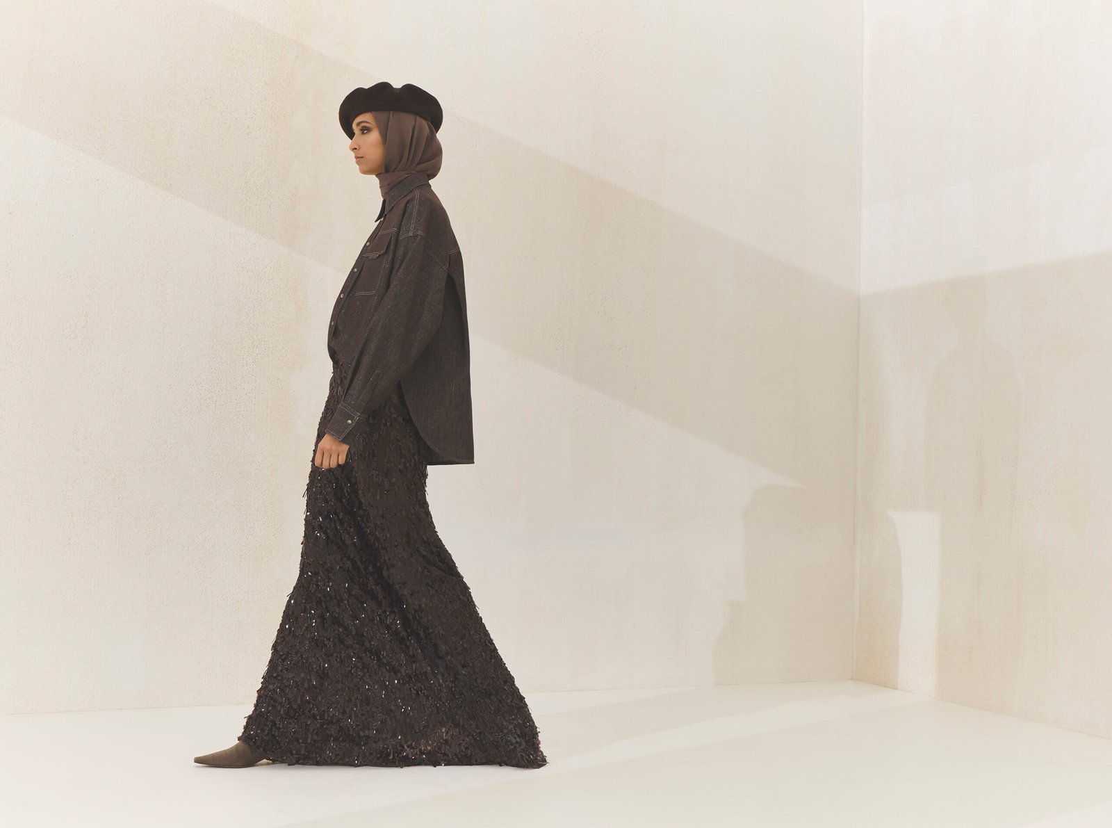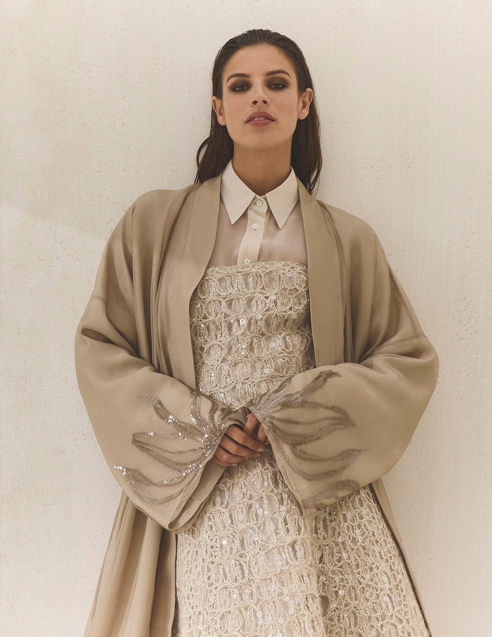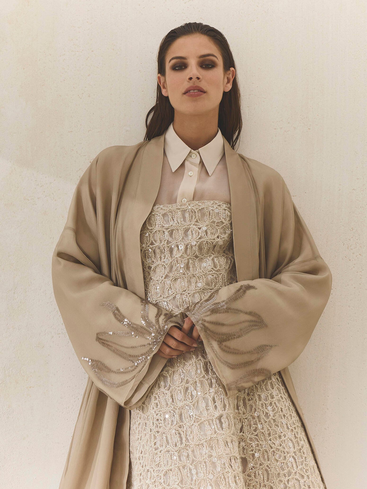 Rooted in the dialogue between instinct and reason, Cuccinelli’s Abaya Capsule Collection offers a refined synthesis of traditional elegance and contemporary ease. Tailored yet fluid, each piece balances structure and softness through noble materials, artisanal details, and essential silhouettes designed for lightness, comfort, and versatility. Crispy silks bring movement, while florals, croc-effect embroideries, and fil coupé motifs add depth and rhythm. A palette of sand, stone, cocoa, and cloud, punctuated by deep burgundy and slate, grounds the collection emotionally, with layered styling and discreet accessories reinforcing a vision of modern heritage that feels both composed and instinctively graceful.