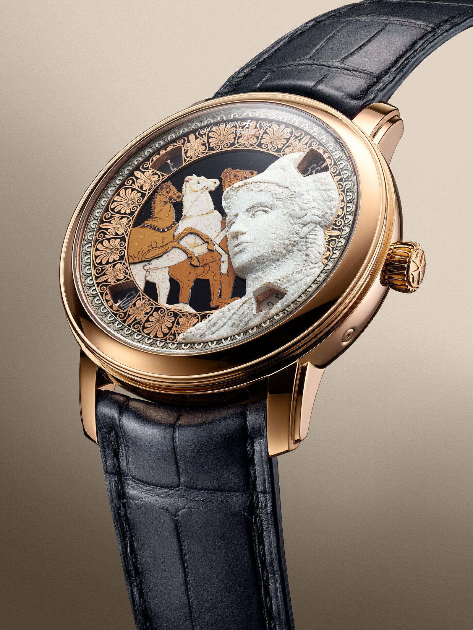 The dials are where this alchemy unfolds. Constructed as multi-layered compositions, they bring together nine distinct decorative crafts, among them glyptic carving, Grand Feu enamel, engraving, marquetry, and micro-mosaic. The result is extraordinary depth and miniature worlds where central effigies emerge, framed by intricate friezes that echo the artistic language of their respective eras. Powering each piece is the Manufacture Calibre 2460 G4/2, a self-winding movement that reimagines how time is displayed. Rather than obscuring the dial with traditional hands, four discreet apertures are positioned at the periphery, indicating hours, minutes, day, and date. It is a technical decision that removes distraction, allowing the artistry to remain uninterrupted, and preserving the visual integrity of each civilisation’s narrative.