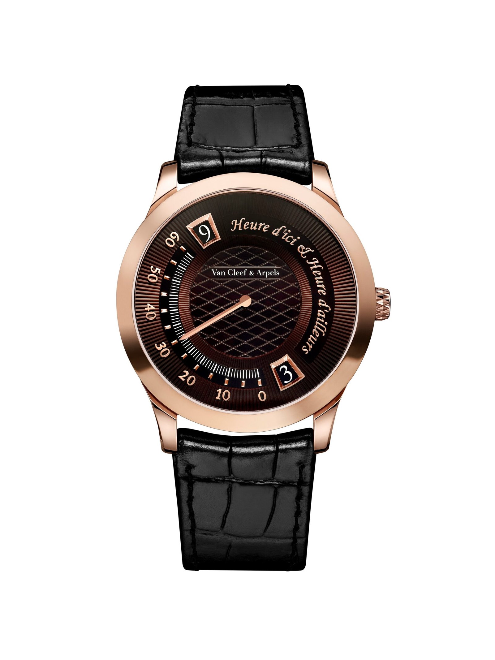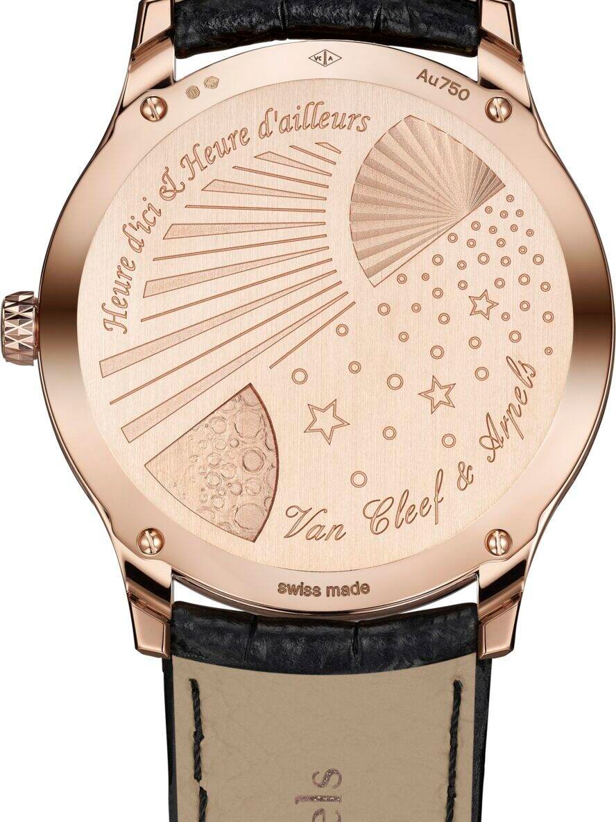 Travel, too, becomes poetic in the Midnight Heure d’ici & Heure d’ailleurs. Designed to track two time zones simultaneously, the watch reframes functionality as invitation, each glance suggesting movement between worlds. The dial, rendered in a richly nuanced amber-brown enamel, reveals subtle shifts in tone depending on the light, echoing the changing atmospheres of distant places. Guilloché and piqué motifs radiate outward, creating a sense of quiet motion beneath the surface. Mechanically, the piece is no less considered. Dual jumping hours align with a retrograde minute hand, resetting itself in a precise gesture at the end of each hour.