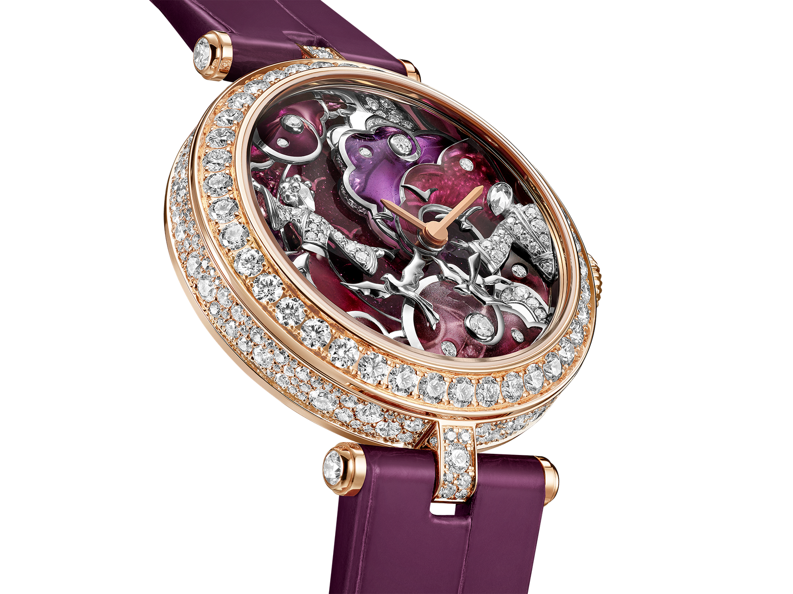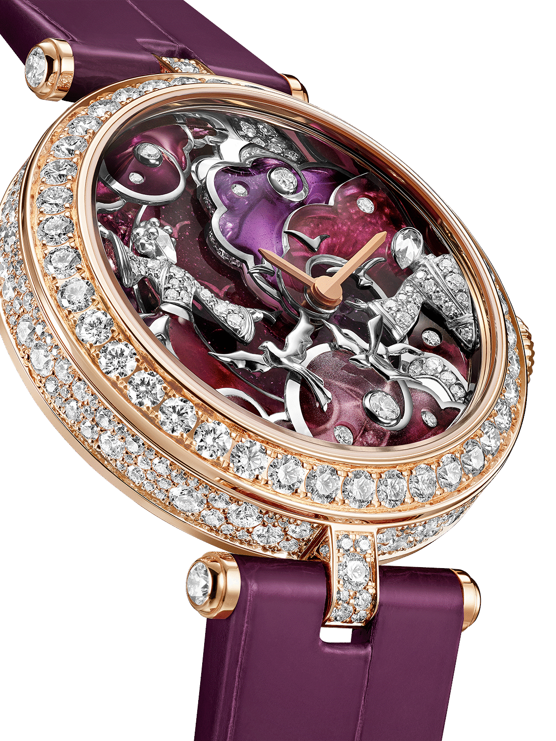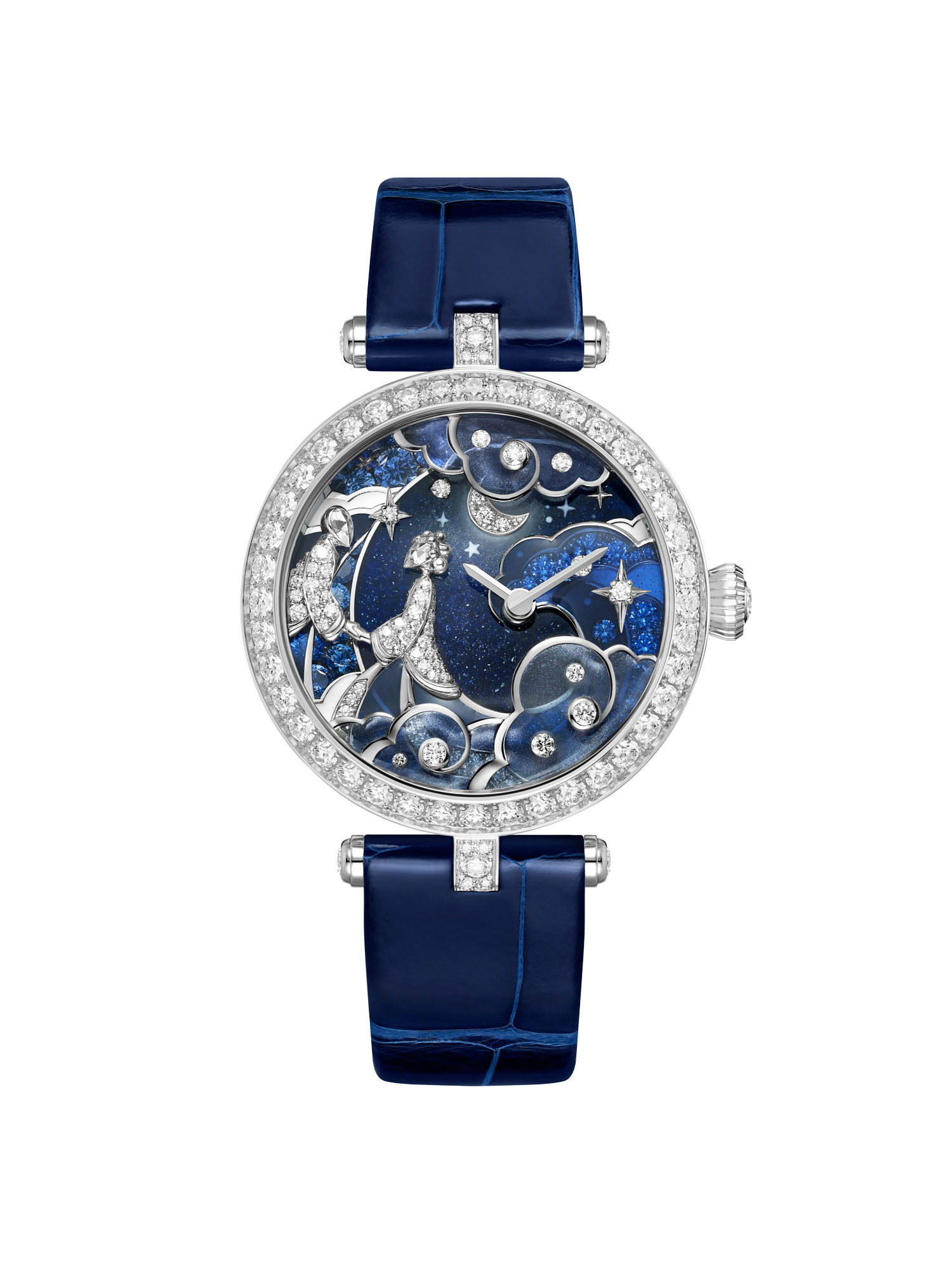 At the heart of this year’s presentation lies a story of love written across the stars. The Lady Rencontre Céleste and Lady Retrouvailles Célestes watches draw from the ancient legend of Vega and Altair, lovers separated by the heavens and reunited just once a year. Rendered through an extraordinary combination of métiers d’art, each dial becomes a miniature world. Champlevé, grisaille, and plique-à-jour enamel techniques layer light and depth, while diamonds and sapphires punctuate the scene with moments of brilliance. Figures emerge softly from clouds, their gestures capturing longing, reunion, and the fragile passage between.