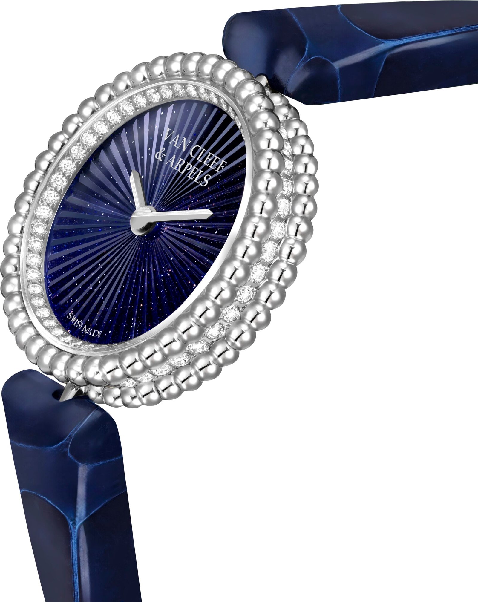 The Perlée watch, by contrast, embraces light. Its signature golden beads form a luminous halo around a dial of deep blue aventurine glass, flecked with star-like inclusions. Diamonds trace the case with a quiet brilliance, while interchangeable straps allow the piece to shift with the wearer’s mood. Together, they underscore the maison’s enduring belief that time can be worn, adorned, and experienced as intimately as any jewel.