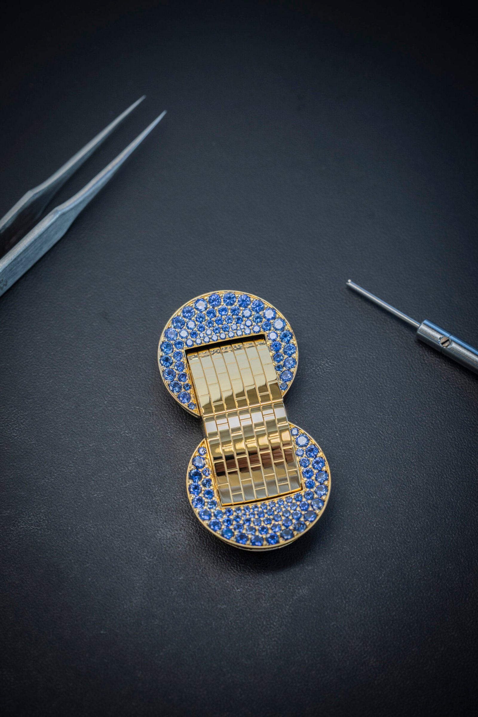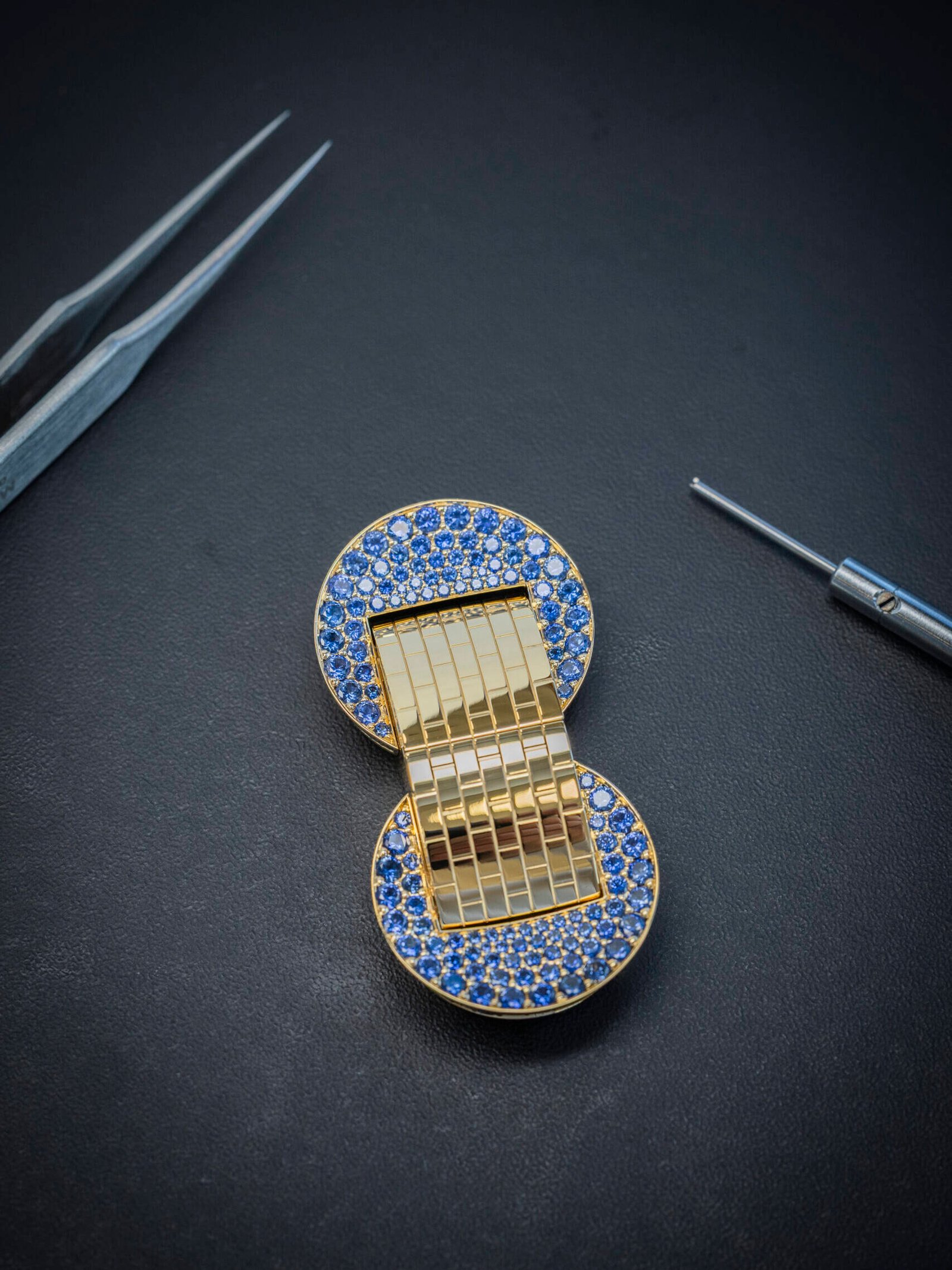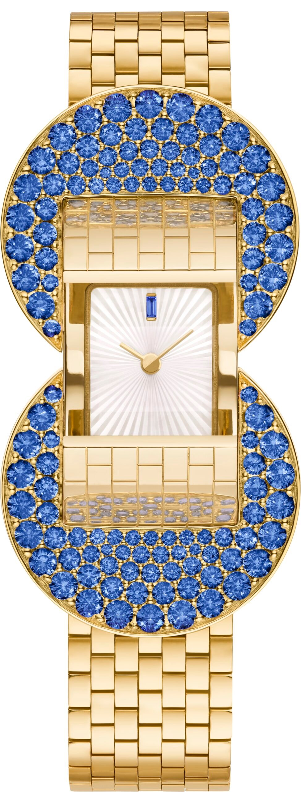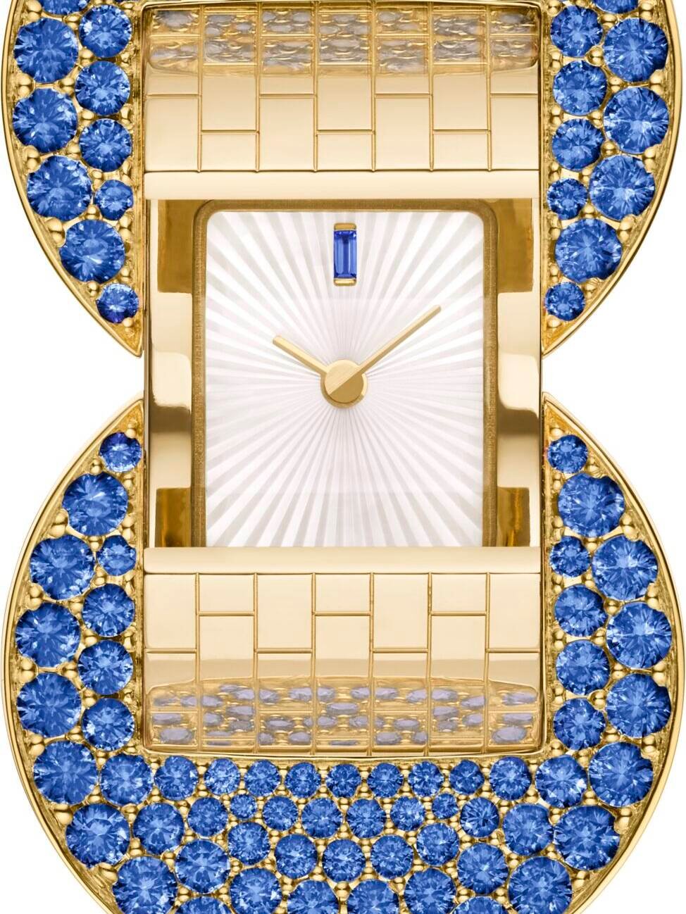 Van Cleef & Arpels has always moved effortlessly between jewellery and watchmaking, and nowhere is this more evident than in its jewels that tell time. The Ludo Secret watch revisits a design first introduced in 1934, its belt-like bracelet rendered in articulated yellow gold links that wrap the wrist with a fluid softness. Set with carefully selected sapphires of velvety blue, the piece conceals its dial beneath a clasp, revealing time only on demand.